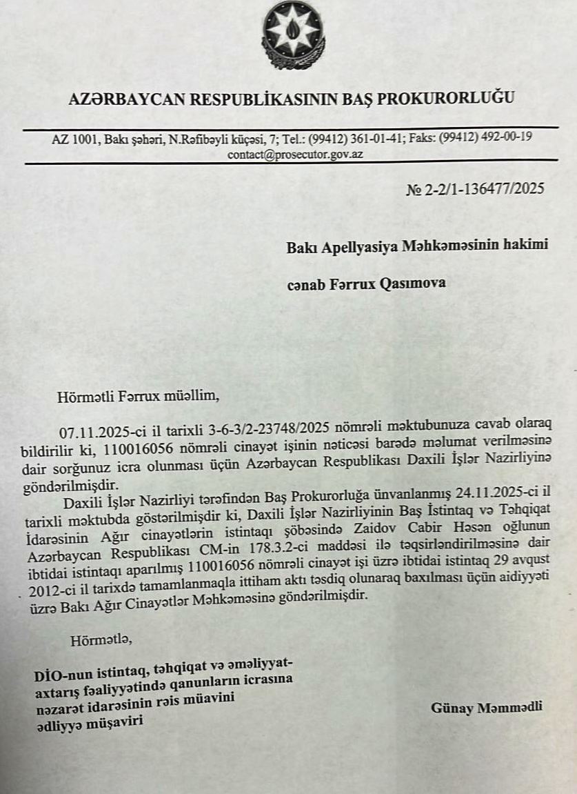 Xatırladaq ki, bir müddət əvvəl C.Zaidovun barəsindəki cinayət işi ilə bağlı prokurorluğa sorğu ünvanlanıb. Həmin vaxt Baş Prokurorluğun DİO-nun istintaq, təhqiqat və əməliyyat- axtarış fəaliyyətində qanunların icrasına nəzarət idarəsinin rəis müavini Günay Məmmədlinin adından göndərilən cavab məktubunda işin Bakı Ağır Cinayətlər Məhkəməsinə göndərilməsi bildirilib. Daha sonra məhkəməyə müraciət edildikdə isə, onlara həmin işin Bakı Ağır Cinayətlər Məhkəməsində olmadığı bildirilib.