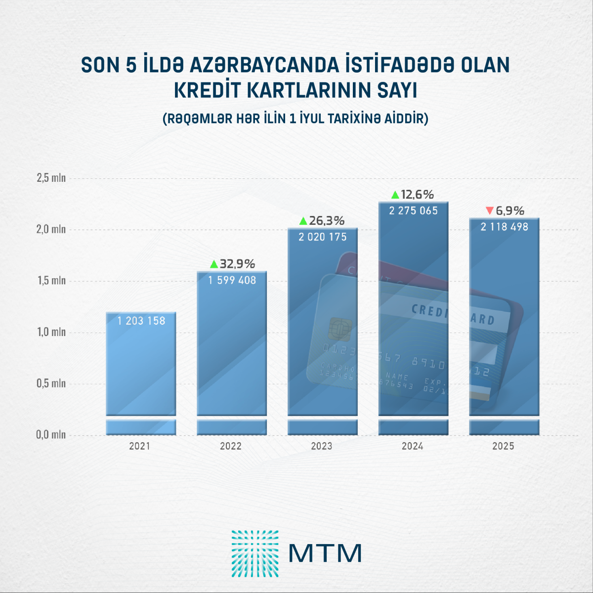 Qeyd edilib ki, məlumat 2025-ci il 1 iyul tarixinə aiddir. Ötən ilin eyni tarixində ölkədəki aktiv kredit kartlarının sayı 2 275 065 ədəd təşkil edirdi. Bu tarixdən öncəki bir il ərzində isə ölkədə kredit kartlarının sayı 12,6% və ya 254 890 ədəd artmışdı. Ümumilikdə, son bir ili nəzərə almasaq, kredit kartlarının sayında hər il daimi artım qeydə alınırdı.