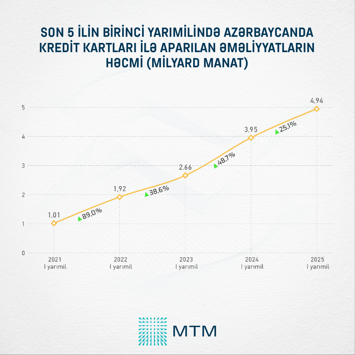 Bu kredit kartları ilə aparılan əməliyyatların həcmi isə cari ilin birinci yarısında rekord həddə çatıb. Cari ilin yanvar-iyun aylarında kredit kartları ilə aparılan əməliyyatların həcmi ötən ilin eyni dövrü ilə müqayisədə 25,1% və ya 0,99 milyard manat artaraq 4,94 milyard manata çatıb. Qeyd edək ki, ötən ilin birinci yarısında bu göstərici 3,95 milyard manata bərabər idi.