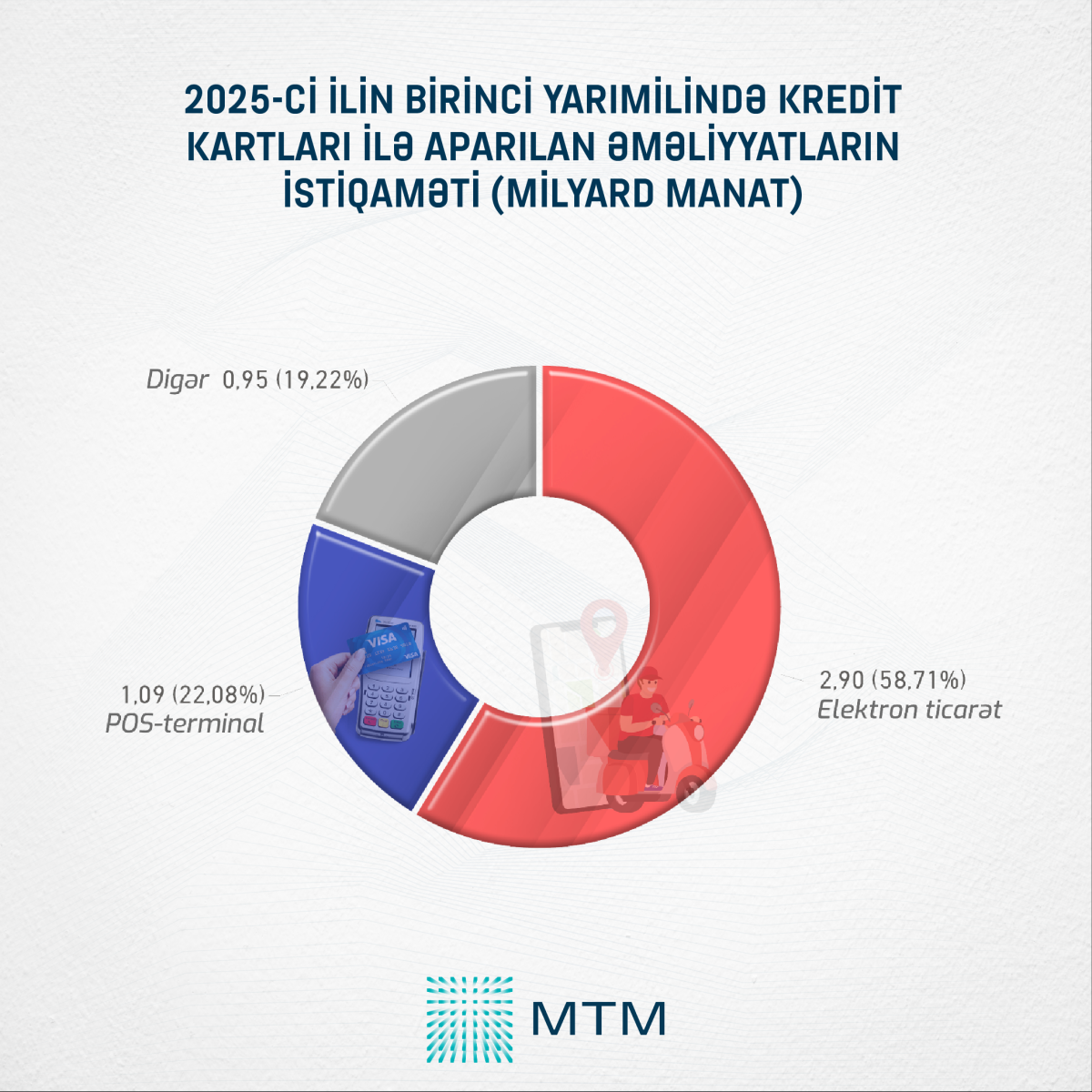 Kredit kartları ilə aparılan ölkədaxili əməliyyatların böyük hissəsini isə elektron ticarət üçün edilən ödənişlər tutur. Cari ilin ilk 6 ayında ölkə əhalisi kredit kartları vasitəsilə elektron ticarət üzrə 2,9 milyard manat həcmində alış-veriş edib ki, bu da kredit kartları ilə aparılan əməliyyatların 58,71%-ni təşkil edir.