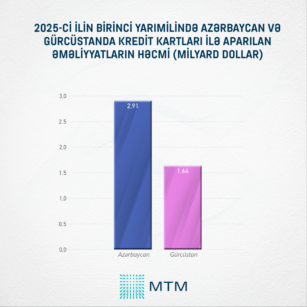 Bu kartlar ilə aparılan əməliyyatların həcmi isə Azərbaycanda 2,91 milyard dollar, Gürcüstanda isə 1,64 milyard dollar olub. Hər iki Cənubi Qafqaz ölkəsində əhalinin hər 5 nəfərinə 1 kredit kartı düşür. Adambaşına kredit kartlarından orta aylıq istifadə həcmi isə Azərbaycanda 47,3 dollar, Gürcüstanda isə 73,8 dollar təşkil edib.