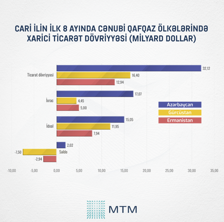 Eyni dövrdə xarici ticarət göstəriciləri nəticəsində Gürcüstanda -7,5 milyard dollar, Ermənistanda isə -2,94 milyard dollar həcmində mənfi saldo yaranıb.