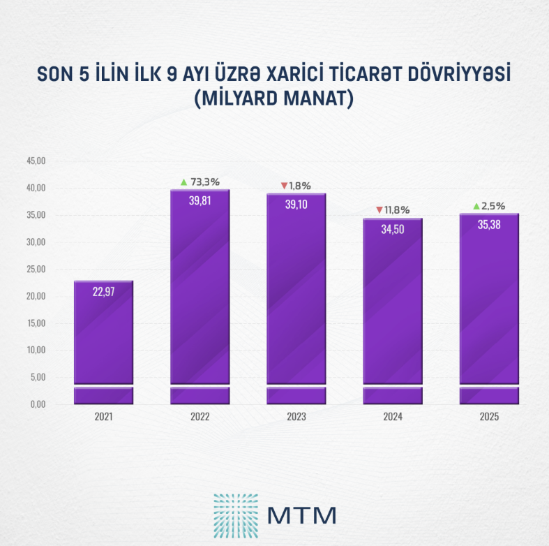 Media Təhlil Mərkəzinin (MTM) Dövlət Gömrük Komitəsinin açıqladığı rəsmi məlumatlar əsasında apardığı təhlilə görə, 2025-ci ilin yanvar-sentyabr aylarında Azərbaycanda xarici ticarət dövriyyəsinin həcmi ötən ilin eyni dövrü ilə müqayisədə 2,5% və ya 0,88 milyard dollar artaraq 35,38 milyard dollara çatıb.