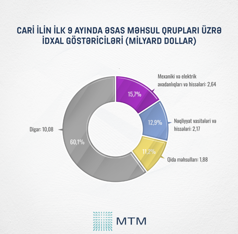 İdxal həcminə gəlincə, 2025-ci ilin ilk 9 ayında bu göstərici ötən ilin eyni dövrü ilə müqayisədə 14,5% və ya 2,13 milyard dollar artaraq 16,77 milyard dollara çatıb.