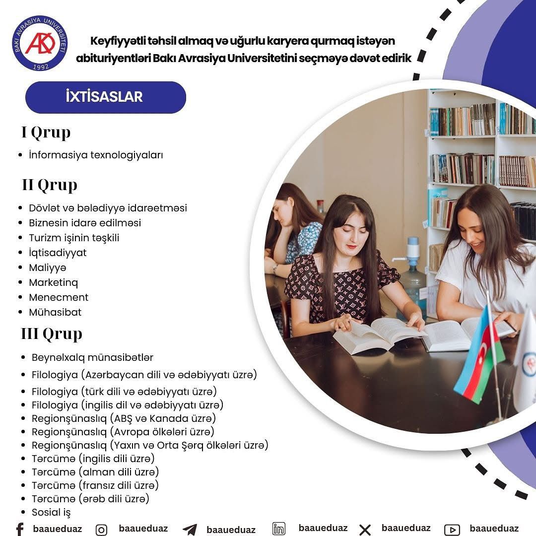 Bakı Avrasiya Universiteti (BAAU) 2025/2026-cı tədris ili üçün bakalavriat səviyyəsində 21 ixtisas üzrə tələbə qəbulu elan edib.