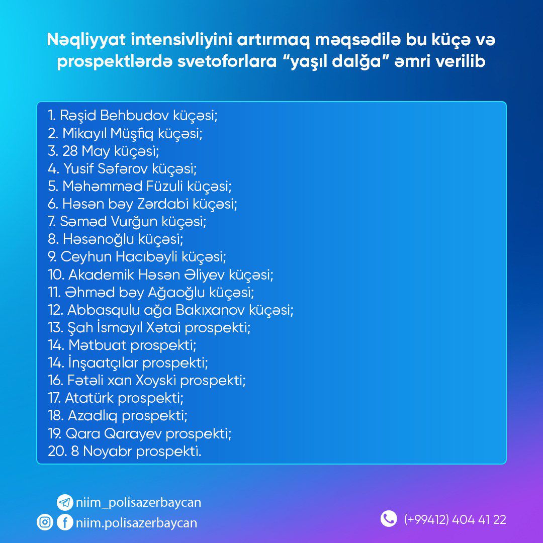 Yeni tədris ilinin başlanması ilə əlaqədar paytaxt yollarında nəqliyyatın intensivliyini artırmaq məqsədilə səhər saatlarından başlayaraq paytaxtın 8 prospektində və 12 küçəsində svetoforlara “yaşıl dalğa” rejimi tətbiq edilir.