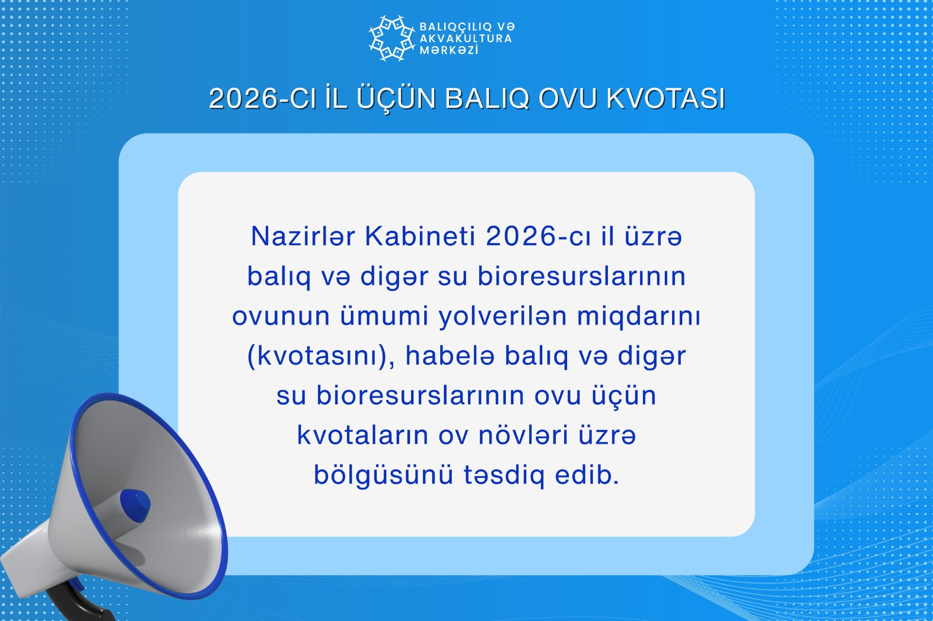 Nazirlər Kabineti 2026-cı il üzrə balıq və digər su bioresurslarının ovunun ümumi yolverilən miqdarını (kvotasını), habelə balıq və digər su bioresurslarının ovu üçün kvotaların ov növləri üzrə bölgüsünü təsdiq edib.