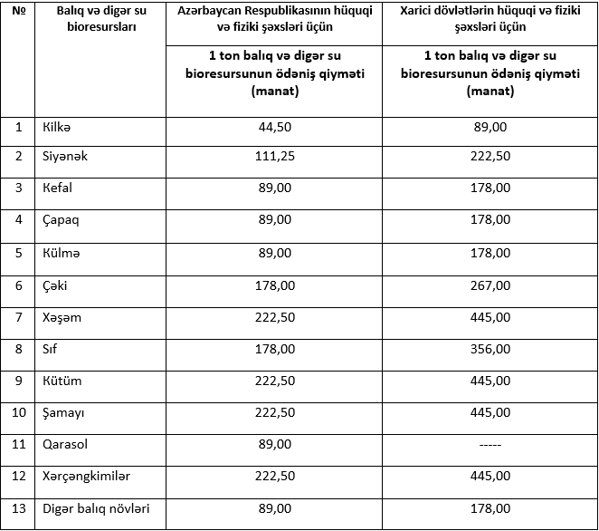 2026-cı ildə balıq və digər su bioresurslarının sənaye, əmtəə məqsədilə akvakultura, təhsil və maarifləndirmə məqsədilə ovuna görə Azərbaycanın və xarici dövlətlərin hüquqi və fiziki şəxsləri üçün müəyyən edilmiş ödəniş qiymətləri: