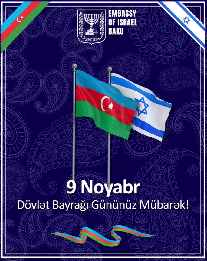 İsrailin Azərbaycandakı səfirliyi 9 Noyabr- Dövlət Bayrağı Günü münasibətilə Azərbaycanı təbrik edib.