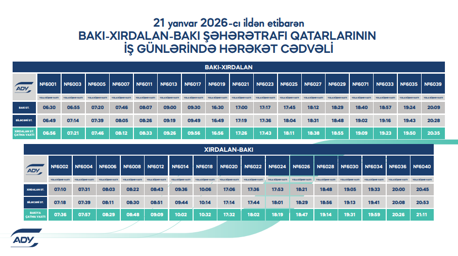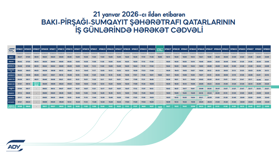21 yanvar tarixindən etibarən Abşeron dairəvi dəmir yolu marşrutu üzrə qatarların hərəkət cədvəlində dəyişikliklər ediləcək.