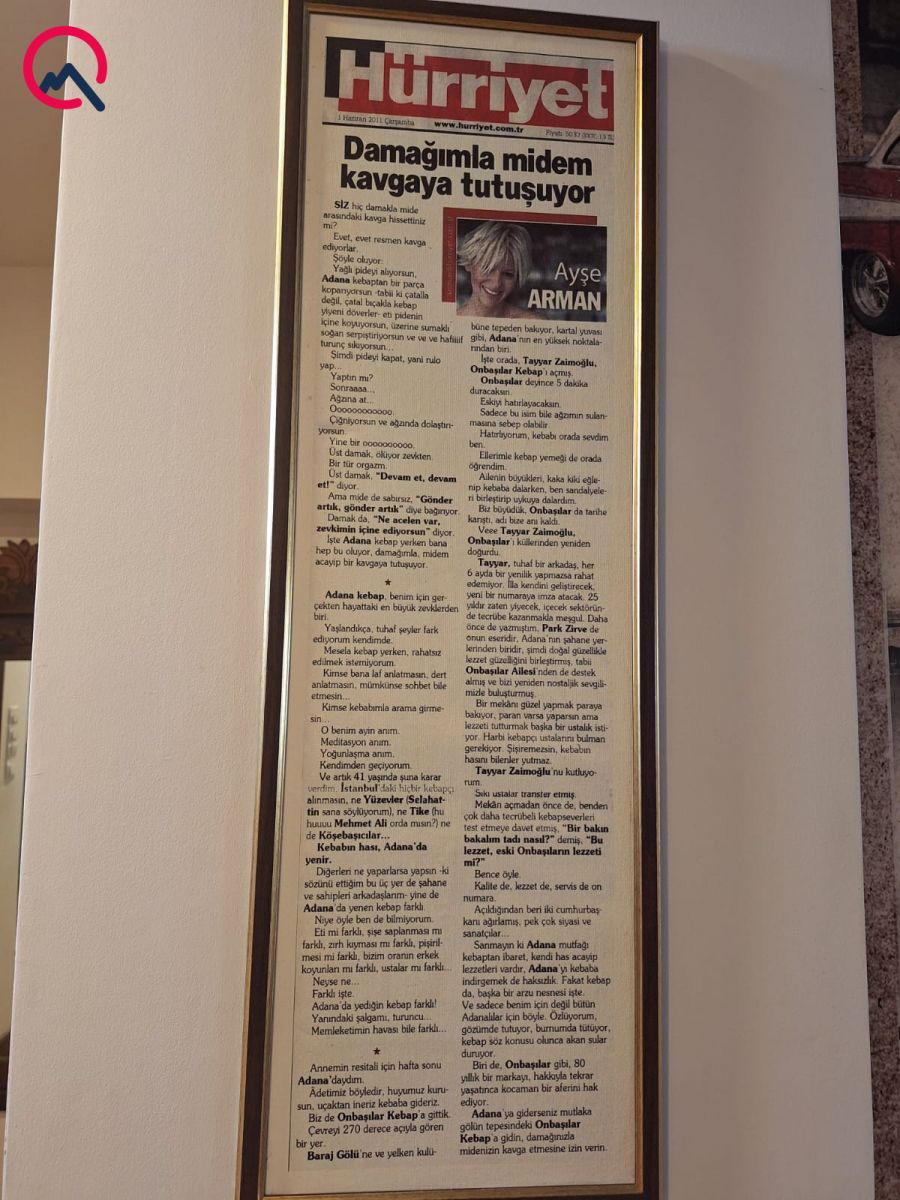 Buna da Adana kababı yediyimiz “Onbaşılar” restoranında rast gəlirəm. 2011-ci ildə “Hürriyet” qəzetində yazılan bu köşə həmin restoranın bir köşəsindən asılıb.