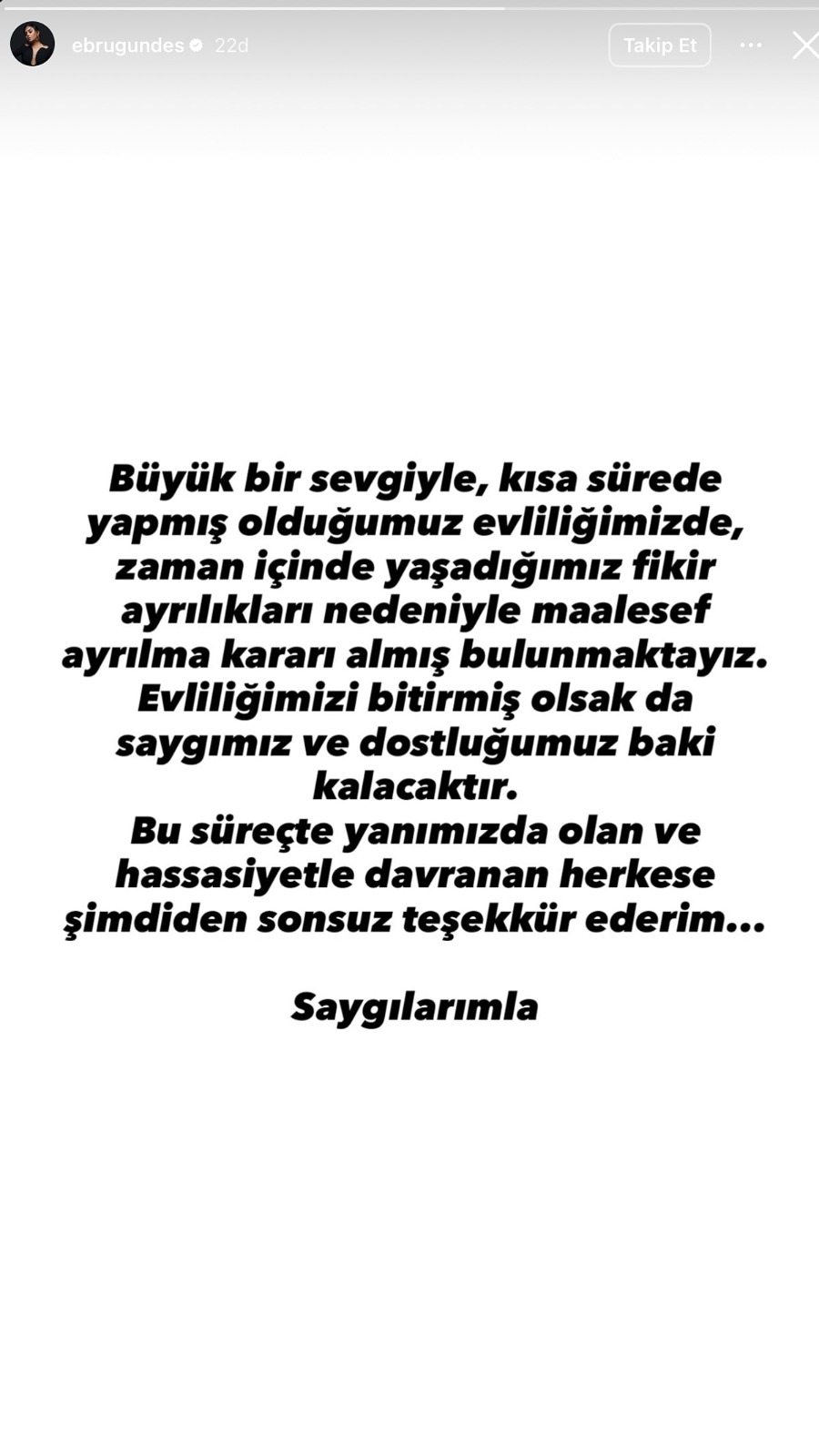“Böyük sevgi və qısa müddətdə başlayan evliliyimizdən zamanla yaşadığımız fikir ayrılıqlarına görə təəssüf ki, ayrılmaq qərarına gəldik. Evliliyimizi bitirsək də, hörmətimiz və dostluğumuz dəyişməz qalacaq. Bu proses boyu bizə dəstək olan və həssaslıqla yanaşan hər kəsə sonsuz təşəkkürümü bildirirəm”.