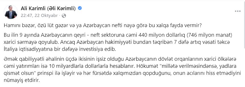 “Bu ilin 9 ayında Azərbaycanın qeyri-neft sektoruna cəmi 440 milyon dollarlıq (746 milyon manat) xarici sərmayə qoyulub. Ancaq Azərbaycan hakimiyyəti bundan təqribən yeddi dəfə artıq vəsaiti təkcə İtaliya iqtisadiyyatına bir dəfəyə investisiya edib. Əmək qabiliyyətli əhalinin üçdə ikisinin işsiz olduğu Azərbaycanın dövlət orqanlarının xarici ölkələrə cəmi yatırımları isə 10 milyardlarla dollarlarla hesablanır”, – deyə paylaşımda qeyd olunub.
