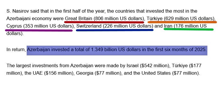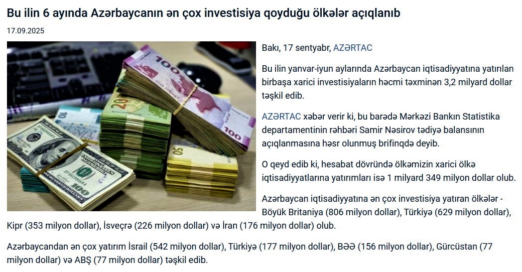 MB-nın Statistika departamentinin rəhbəri tərəfindən açıqlanan məlumata əsasən, 2025-ci ilin yanvar-iyun aylarında Azərbaycan iqtisadiyyatına yatırılan birbaşa xarici investisiyaların həcmi təxminən 3,2 milyard dollar təşkil edib. Azərbaycan iqtisadiyyatına ən çox investisiya yatıran ölkələr - Böyük Britaniya (806 milyon dollar), Türkiyə (629 milyon dollar), Kipr (353 milyon dollar), İsveçrə (226 milyon dollar) və İran (176 milyon dollar) olub. Azertag