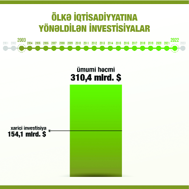 Yeri gəlmişkən, 2004‒2024-cü illər ərzində Azərbaycan iqtisadiyyatına toplam 344,4 milyard ABŞ dolları həcmində sərmayə qoyulub ki, onun 213,2 milyard ABŞ dolları qeyri-neft sektorunun inkişafına yönəldilib. Bu, xarici investorların Azərbaycana olan etimadı, ölkəmizdə hökm sürən təhlükəsizlik və sabitlik mühitinin bariz göstəricisidir.
