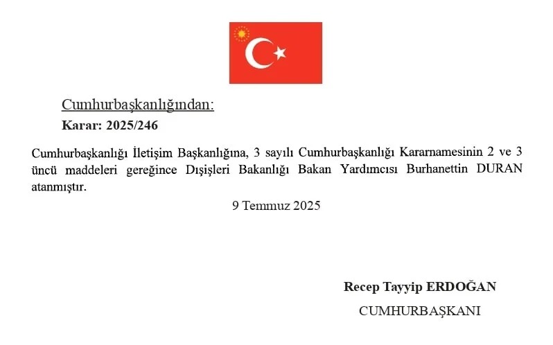 Bu vəzifəyə xarici işlər nazirinin köməkçisi Burhanettin Duran təyin edilib.