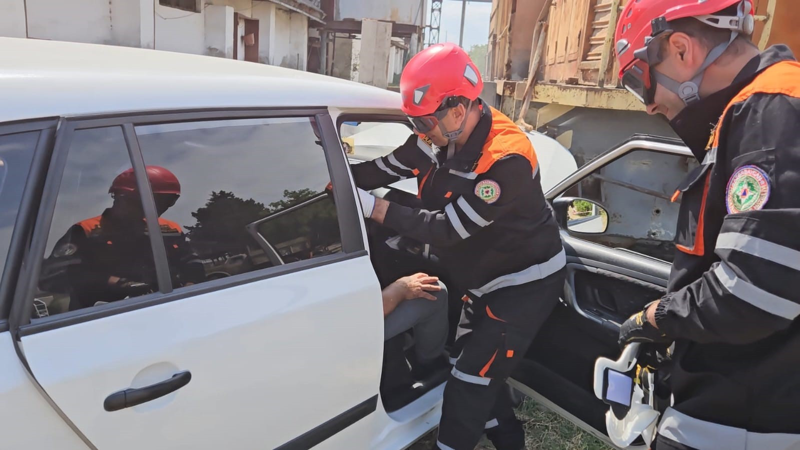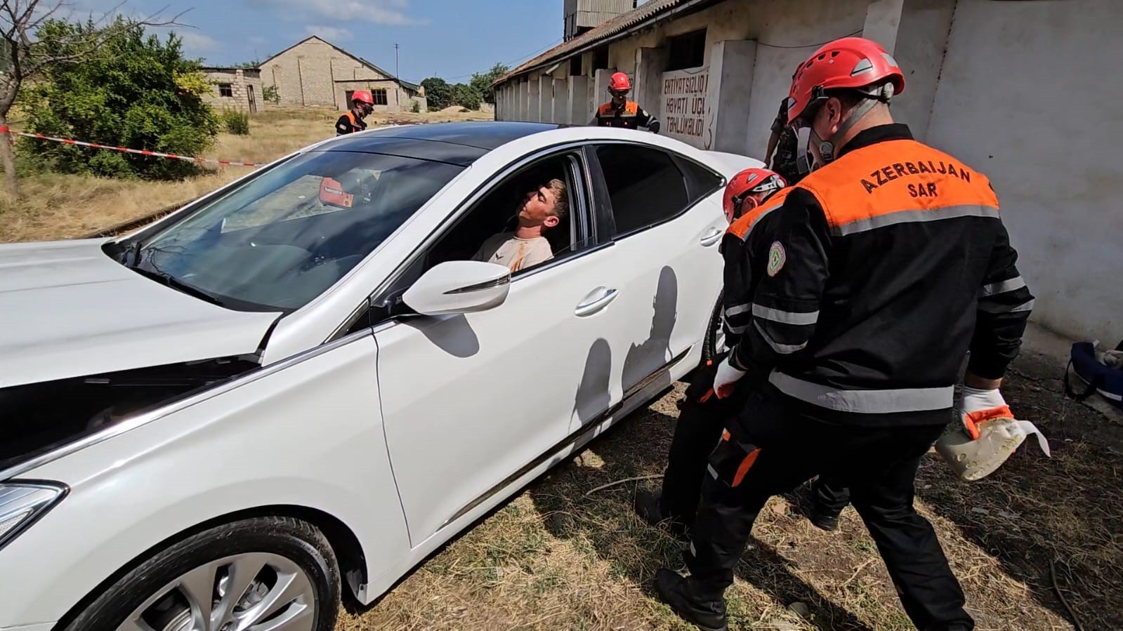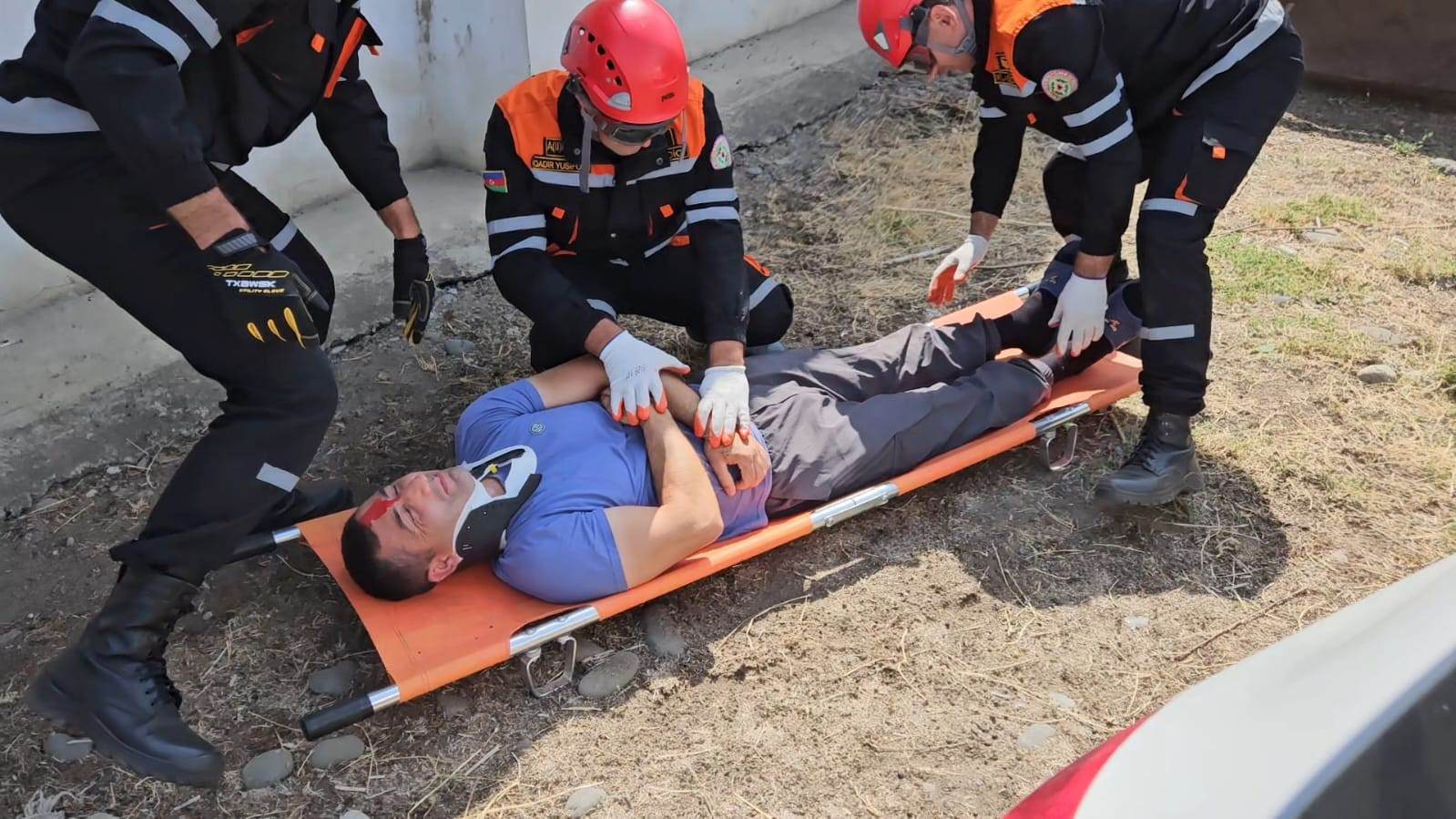Təlim zamanı xilasedicilər tərəfindən şərti nəqliyyat qəzası zamanı deformasiyaya uğramış avtomobildən “zərərçəkmişlər” xilas edilərək onlara “ilkin yardım” göstərilib.
