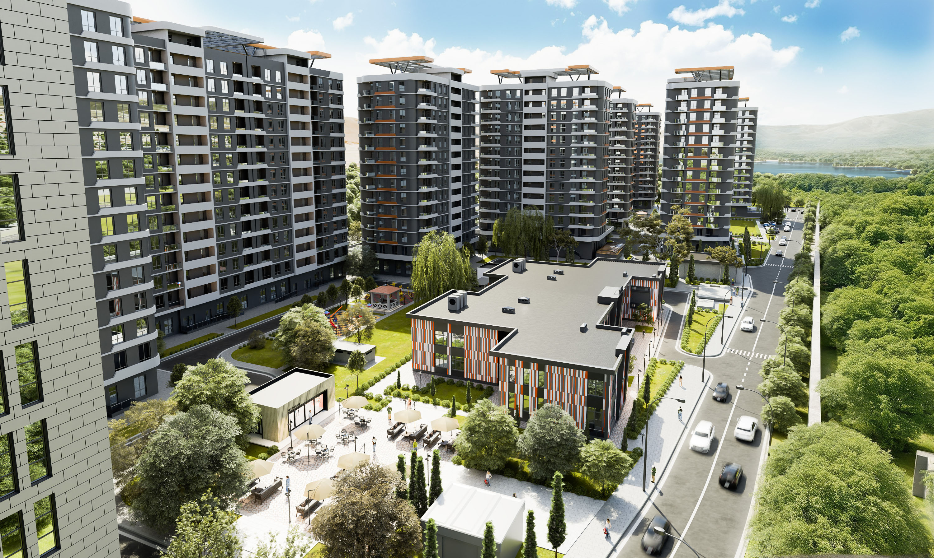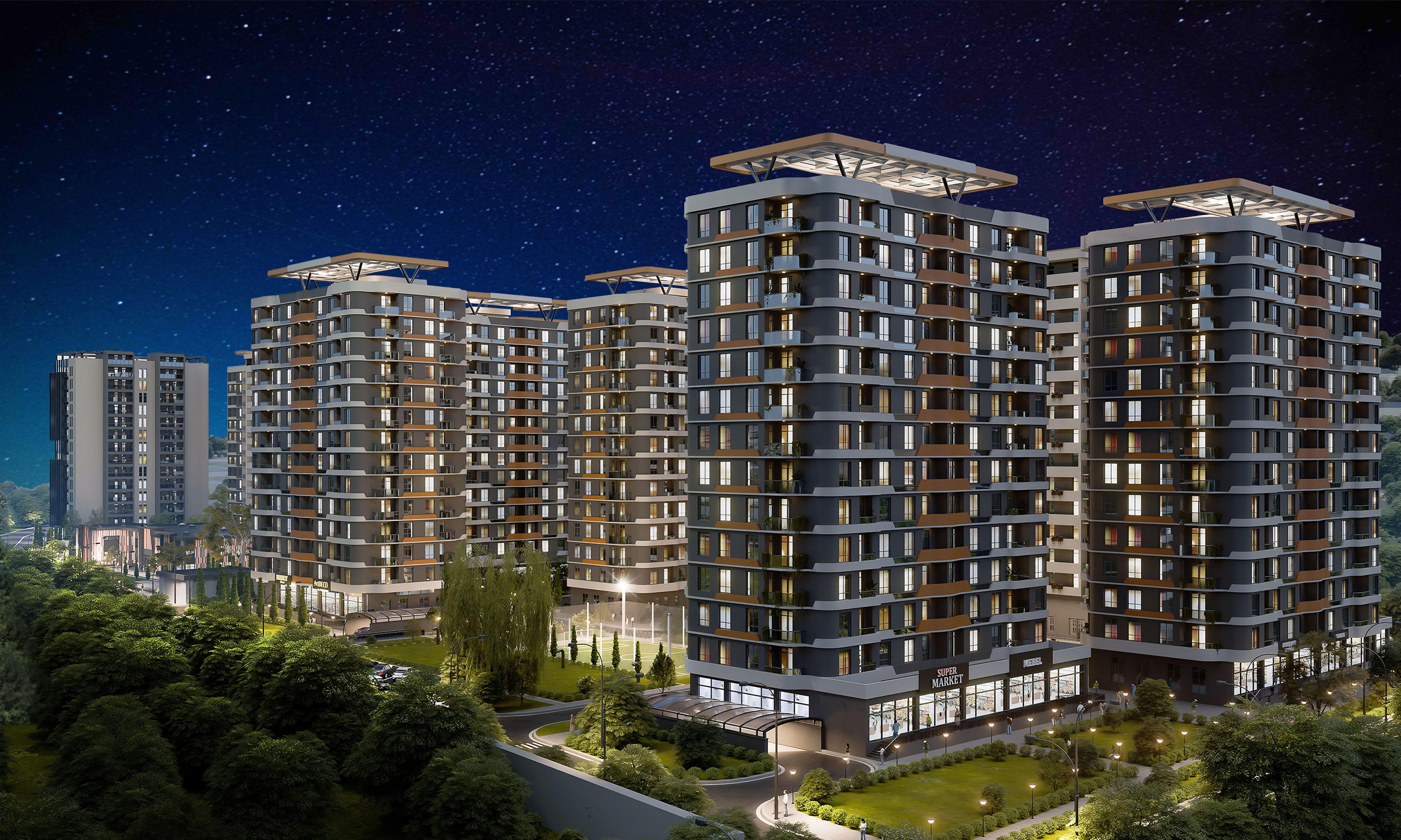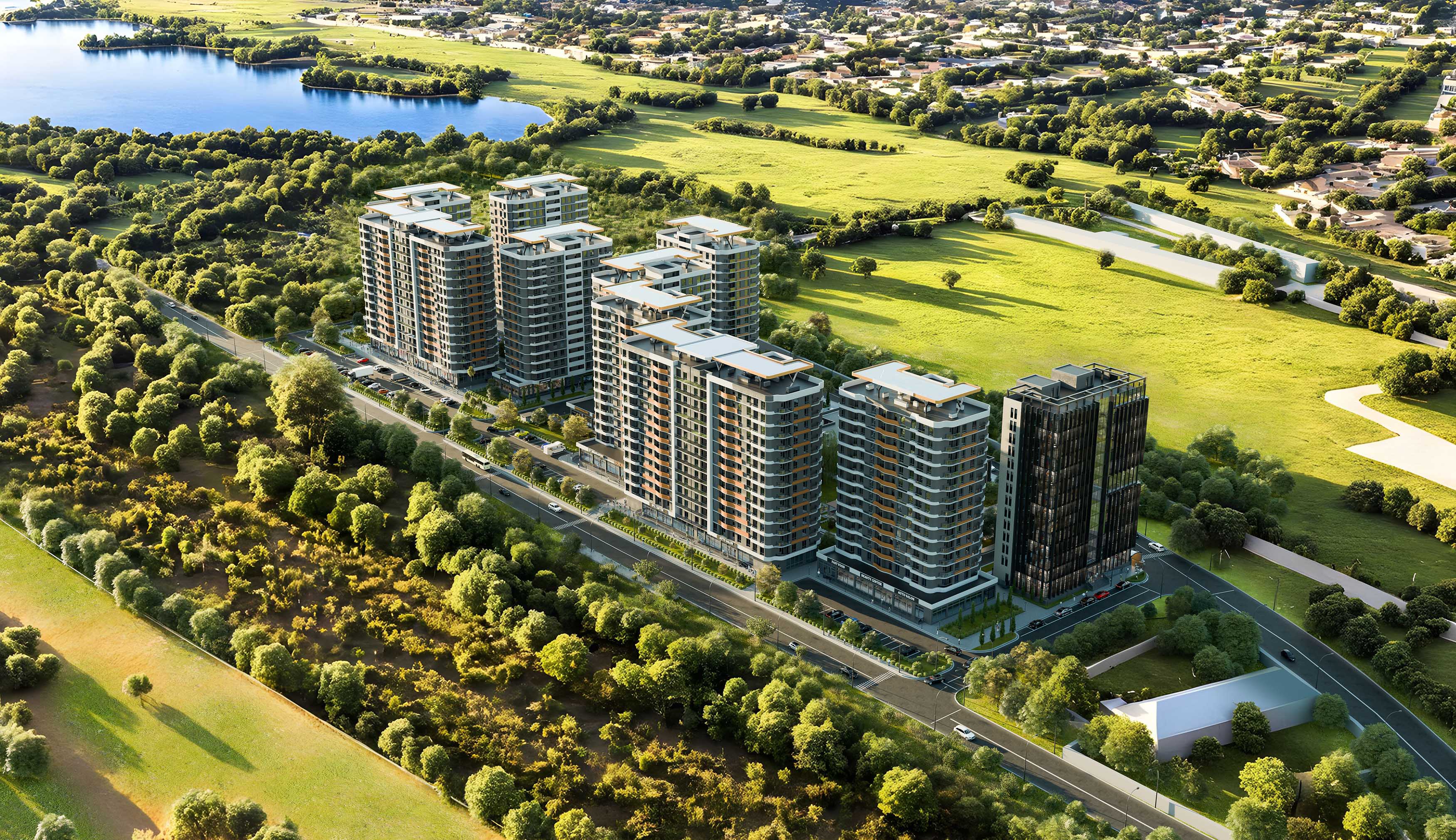 Kompleks daxilində istirahət zonaları, uşaqlar üçün oyun guşələri, geniş şahmat sahəsi, futbol meydançası, o cümlədən ikimərtəbəli böyük alış-veriş və əyləncə mərkəzi, supermarketlər, butiklər, gözəllik salonları, fitness və spa mərkəzi, kafe və restoranlar bina sakinlərinin xidmətində olacaq. İş görüşmələri və biznes fəaliyyətləri üçün kompleksin daxilində 14 mərtəbəli biznes mərkəzi fəaliyyət göstərəcək.