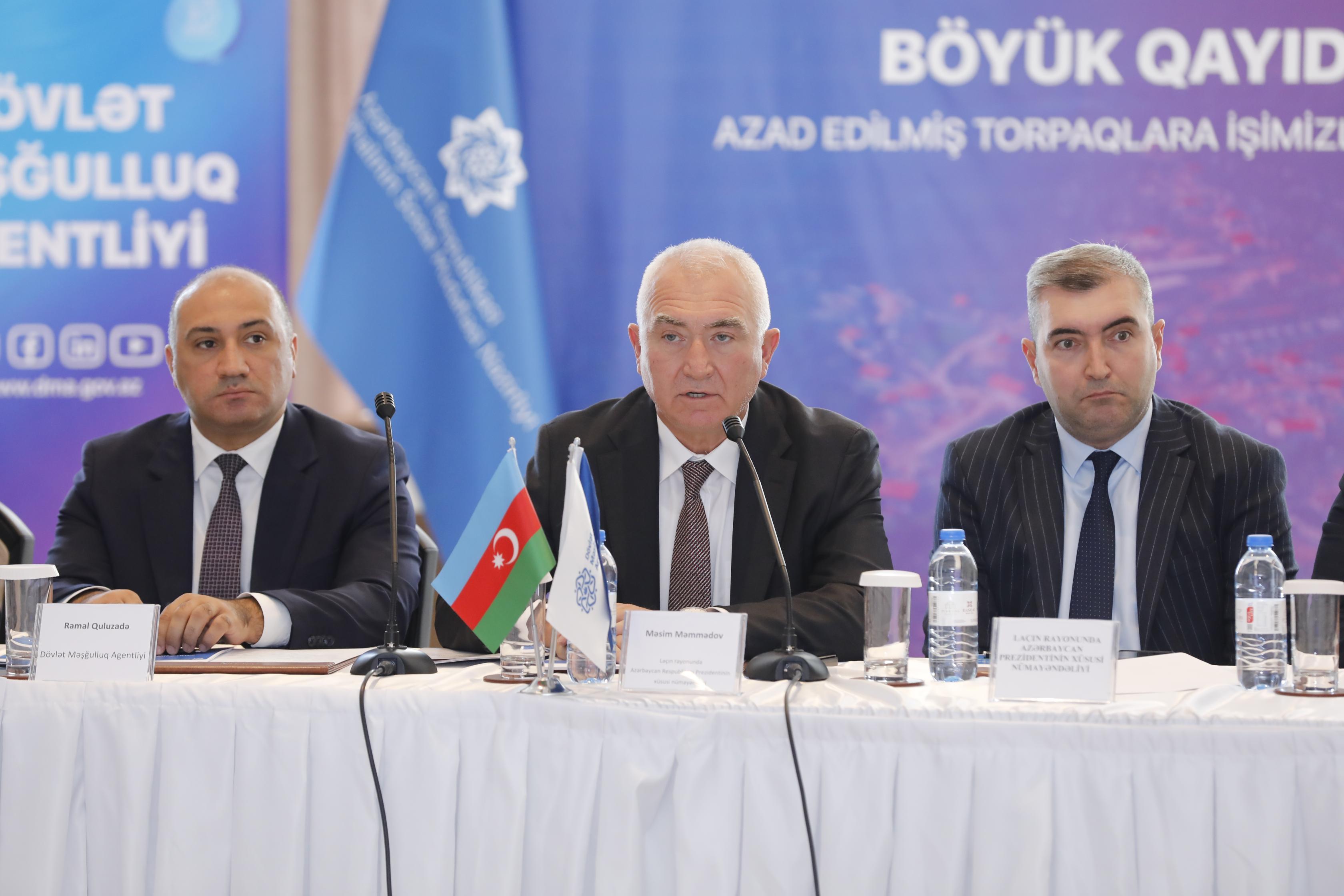 Laçın rayonunda Azərbaycan Prezidentinin xüsusi nümayəndəliyinin və Əmək və Əhalinin Sosial Müdafiəsi Nazirliyinin tabeliyində Dövlət Məşğulluq Agentliyinin Şərqi Zəngəzur Regional Məşğulluq filialının birgə təşkilatçılığı ilə Laçında işəgötürənlərlə görüş keçirilib.