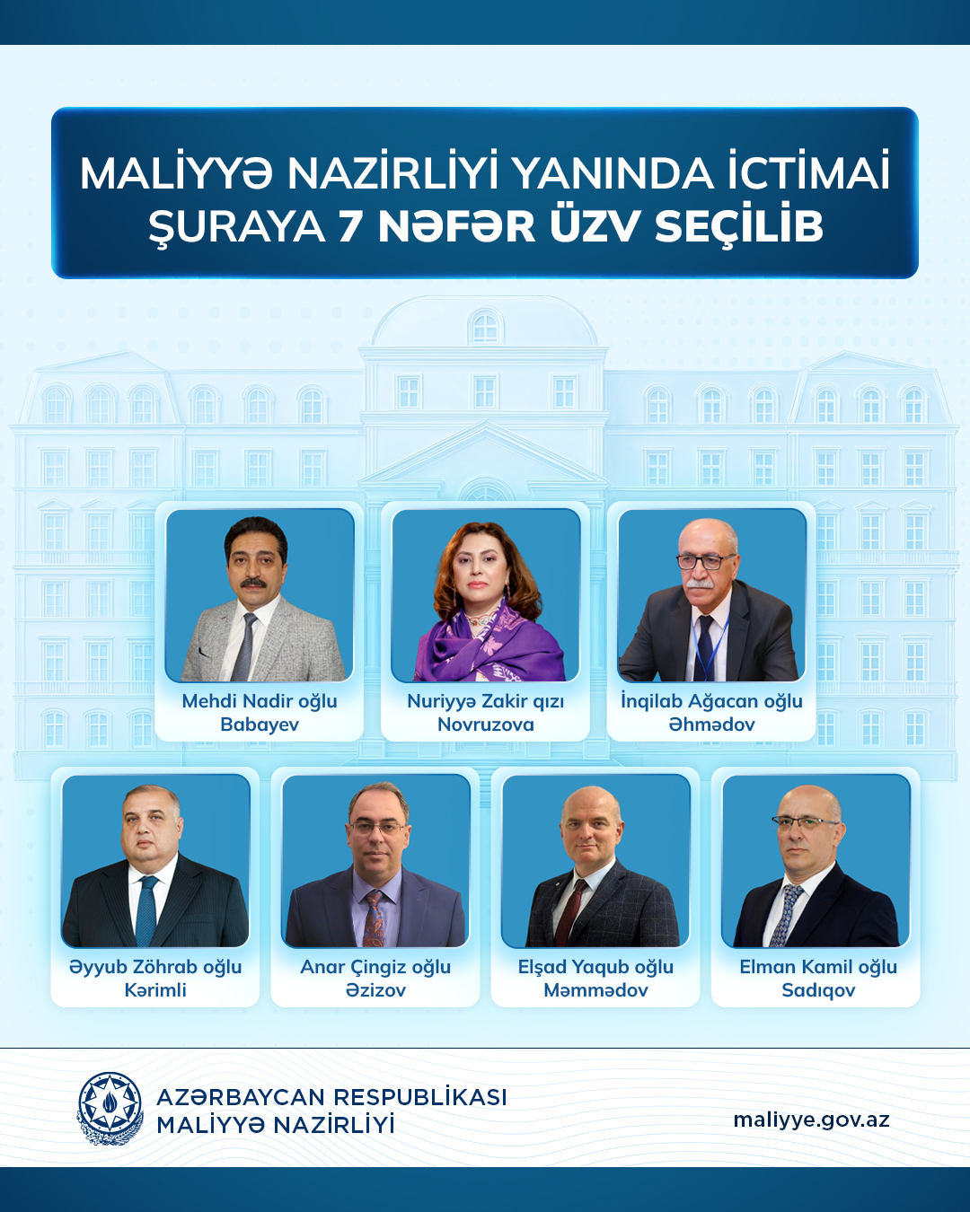 Bildirilib ki, qeydiyyatdan keçmiş vətəndaş cəmiyyəti institutlarının nümayəndələrinin iştirakı ilə obyektiv və şəffaf şəkildə keçirilən səsvermə nəticəsində “İctimai iştirakçılıq haqqında” Qanuna uyğun olaraq aşağıda adları qeyd olunan 7 nəfər Maliyyə Nazirliyi yanında İctimai Şuranın üzvü seçilib: