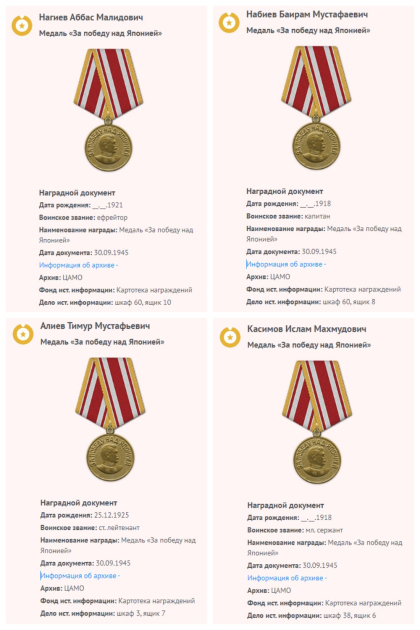Uzaq Şərqdə döyüşənlər arasında hava hücumundan müdafiə qüvvələrinin projektor alayının döyüşçüsü Fəridə Vəzirova da vardı. O, müharibəni Ussuriyskdə başa vurub və medalla təltif edilib. Gəncədən olan hərbi sürücü, Qızıl Ordu əsgəri Hidayət Heydərli Qafqaz və Berlin əməliyyatlarında iştirak etdikdən sonra zenit-artilleriya polkunun tərkibində Uzaq Şərqə göndərilib və burada dövlət mükafatı alıb. Müharibənin ilk günlərindən cəbhədə döyüşən tibb bacısı və artilleriyaçı Mülayim Cəfərova 1945-ci ildə çinli döyüşçülərlə yan-yana döyüşlərdə iştirakına görə “Yaponiya üzərində Qələbə” medalı ilə təltif olunub.