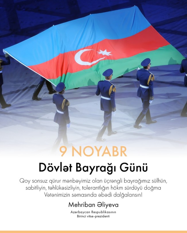 Azərbaycanın Birinci vitse-prezidenti Mehriban Əliyeva 9 Noyabr - Dövlət Bayrağı Günü münasibətilə paylaşım edib.