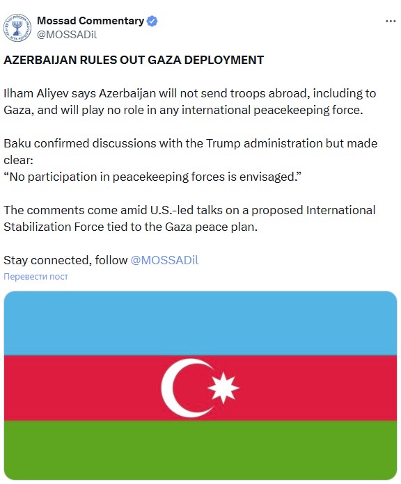 “Bakı Tramp administrasiyası ilə müzakirələrin aparıldığını təsdiqləyib, lakin aydın şəkildə bəyan edib: Hər hansı missiyada iştirak nəzərdə tutulmur”, - “Mossad”ın sosial şəbəkə hesabında Prezidentdən sitat gətirilib.