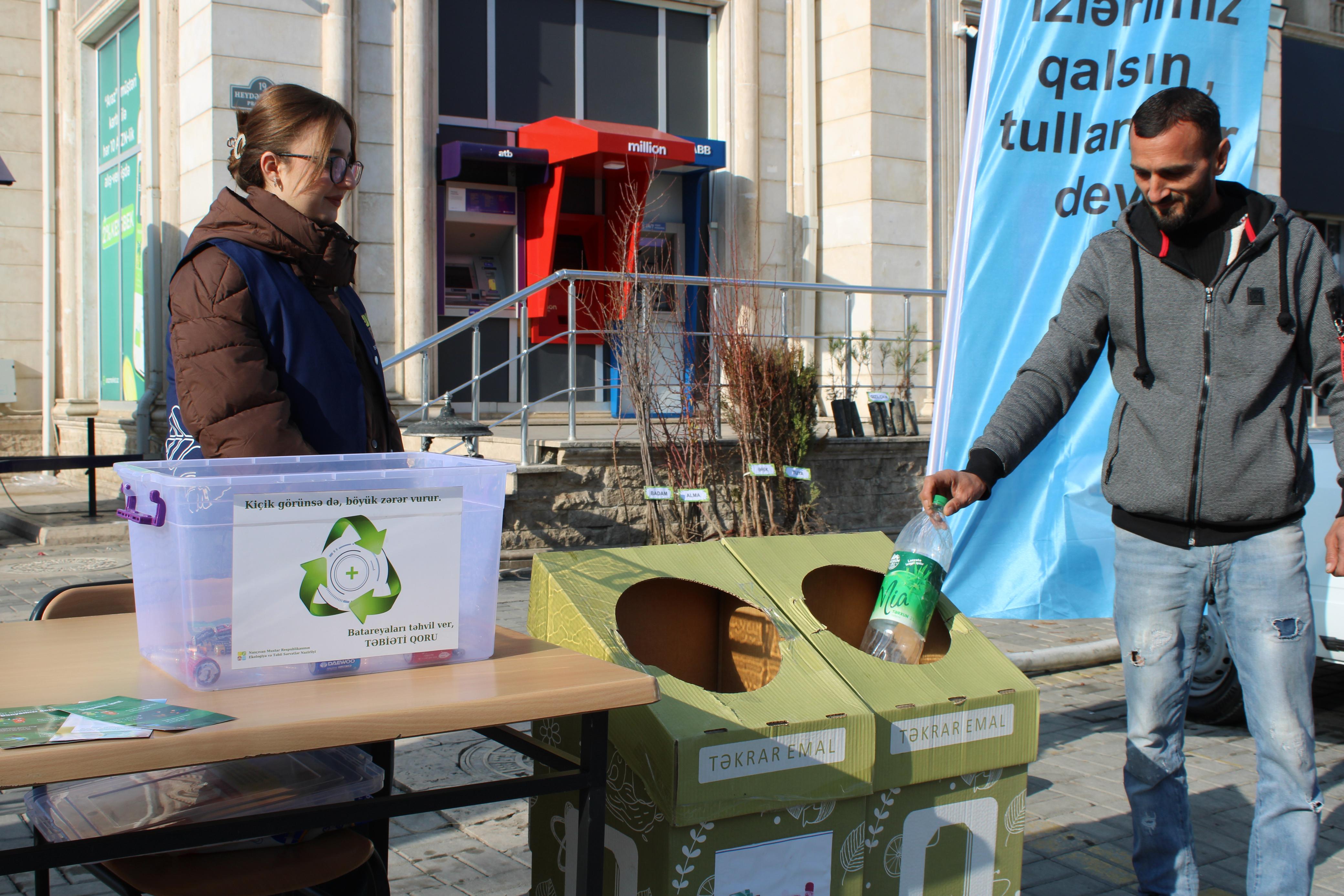 “Qafqazinfo” xəbər verir ki, Naxçıvan şəhəri, Heydər Əliyev prospektində yerləşən “Araz” supermarketin qarşısında təşkil olunan aksiya zamanı vətəndaşlar ümumi tutumu 388 litr olan plastik, 149 litr olan şüşə tullantı, 92 ədəd işlənmiş batareya təhvil verərək əvəzində badam, tuya, alma, ərik və qızılçam tingləri əldə ediblər.