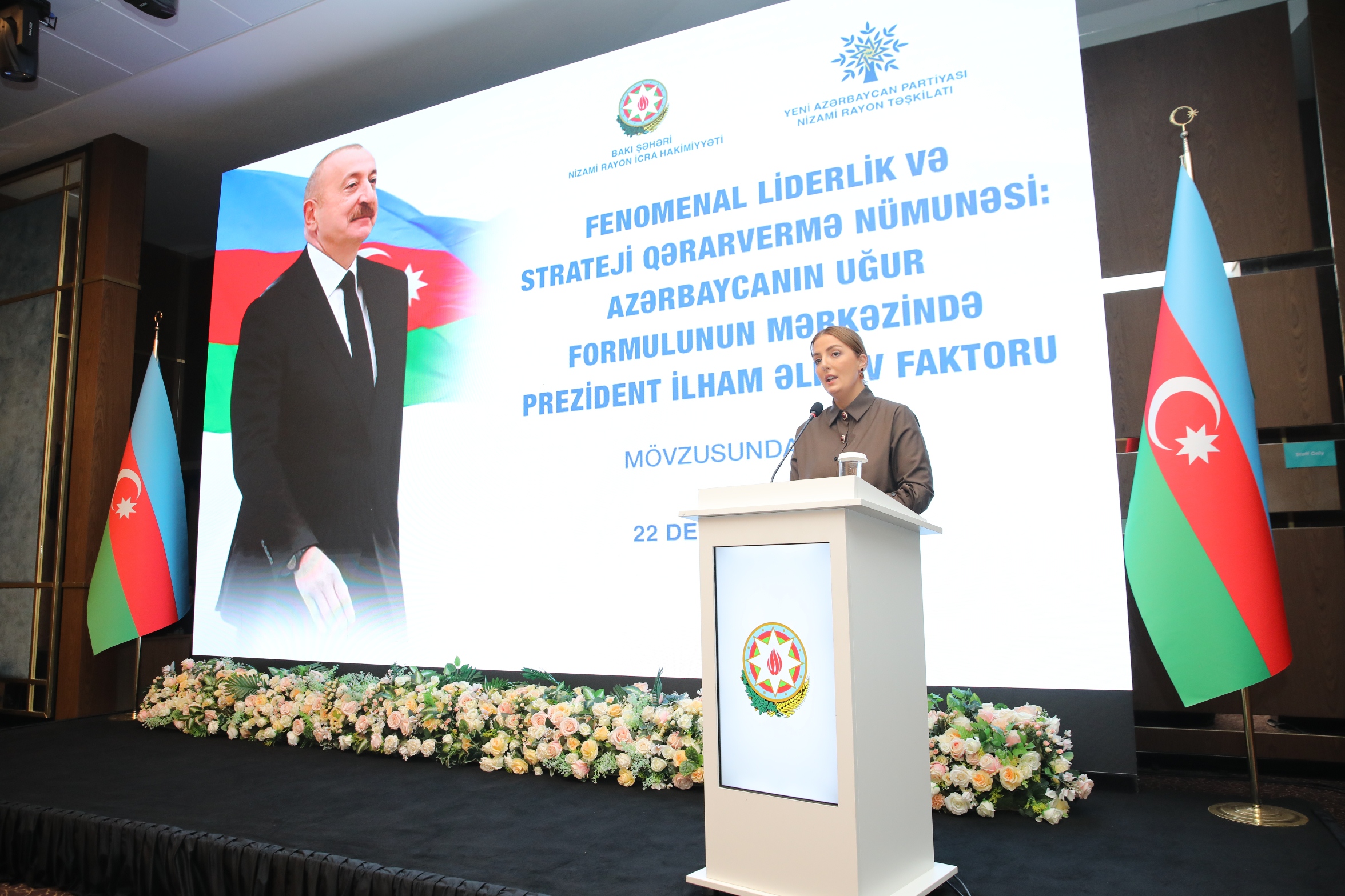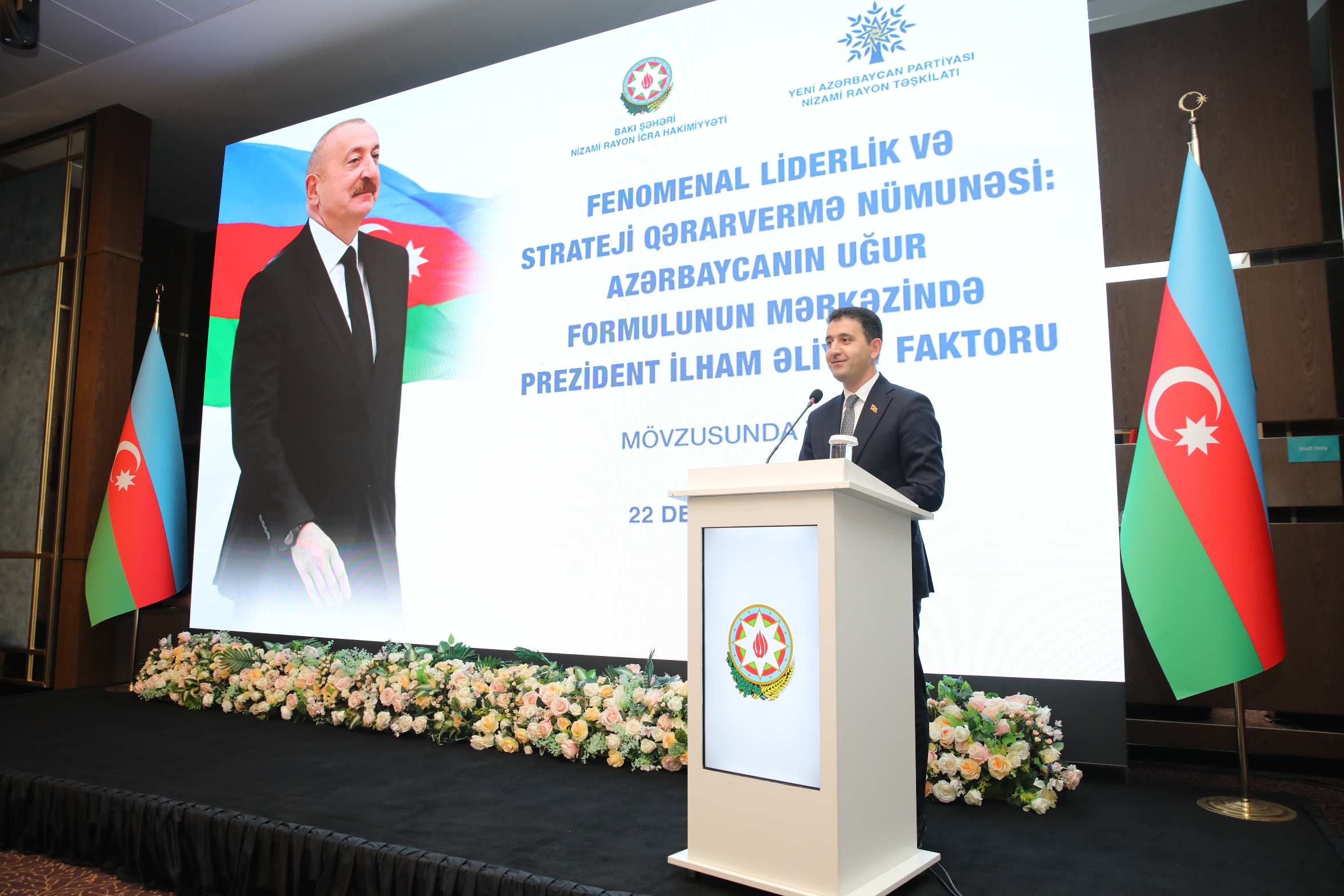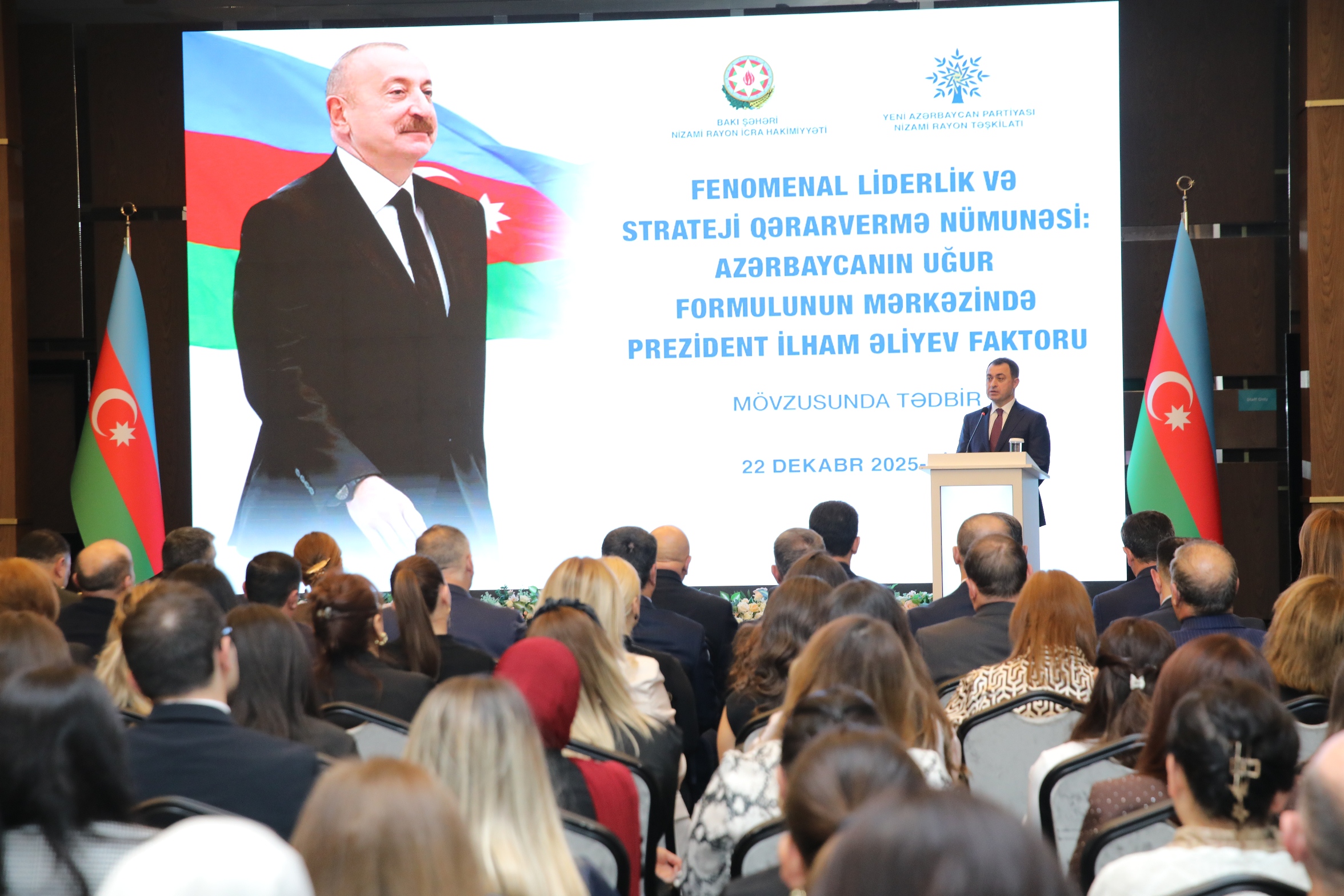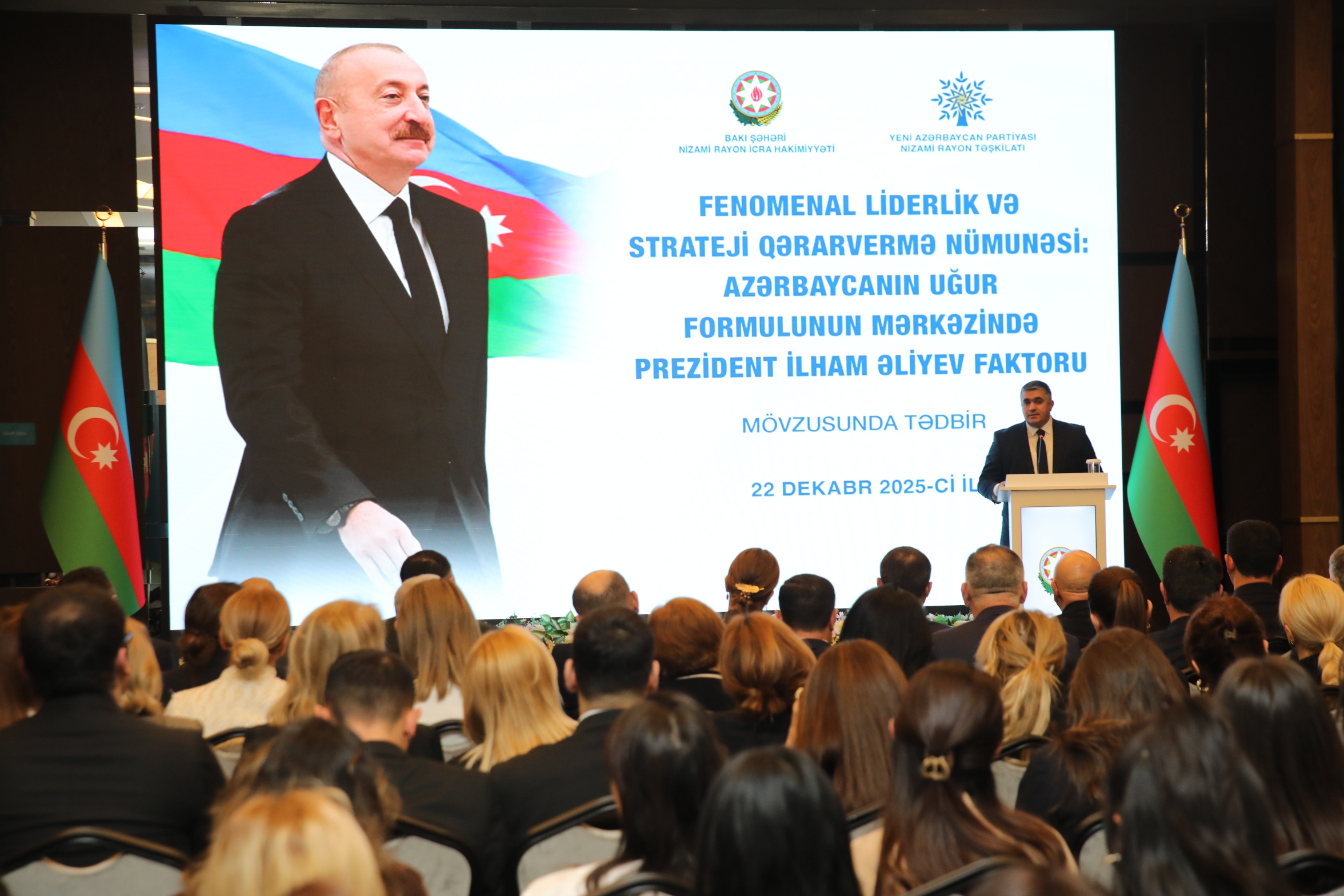 Nizami Rayon İcra Hakimiyyəti və Yeni Azərbaycan Partiyası Nizami rayon təşkilatının birgə təşkilatçılığı ilə dekabrın 22-si “Fenomenal liderlik və strateji qərarvermə nümunəsi: Azərbaycanın uğur formulunun mərkəzində Prezident İlham Əliyev faktoru” mövsusunda tədbir keçirilib.