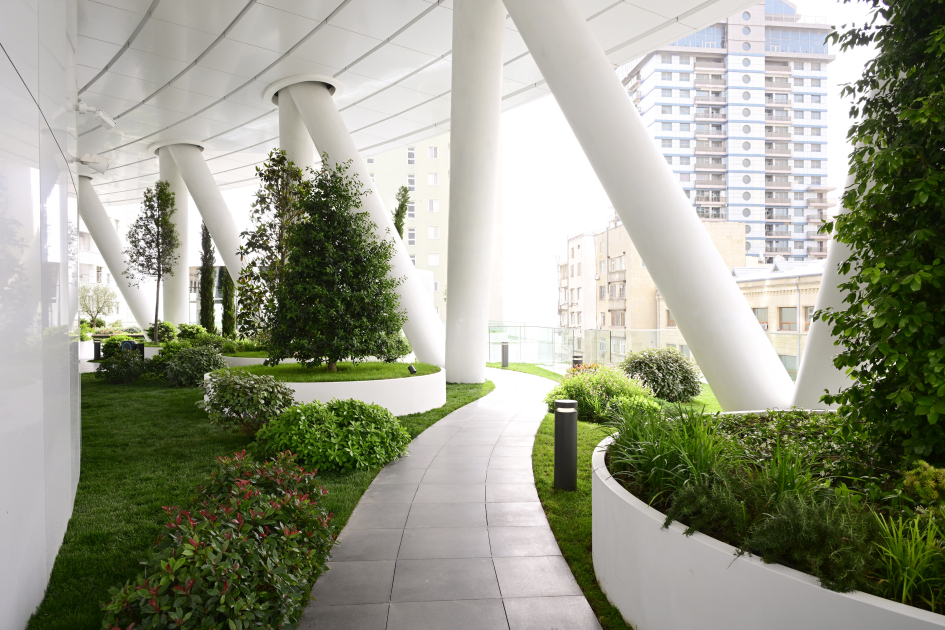 Binanın 5-ci mərtəbəsində 1200 kvadratmetrlik asma bağ salınıb, müxtəlif növ ağac və dekorativ gül kolları əkilib. 500 kvadratmetrlik açıq sahədə əməkdaşların istirahəti və gəzintisi üçün guşə yaradılıb, kafe inşa olunub.