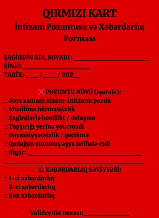 Qırmızı kart – təkrarlanan və ciddi intizam pozuntuları zamanı tətbiq olunur;