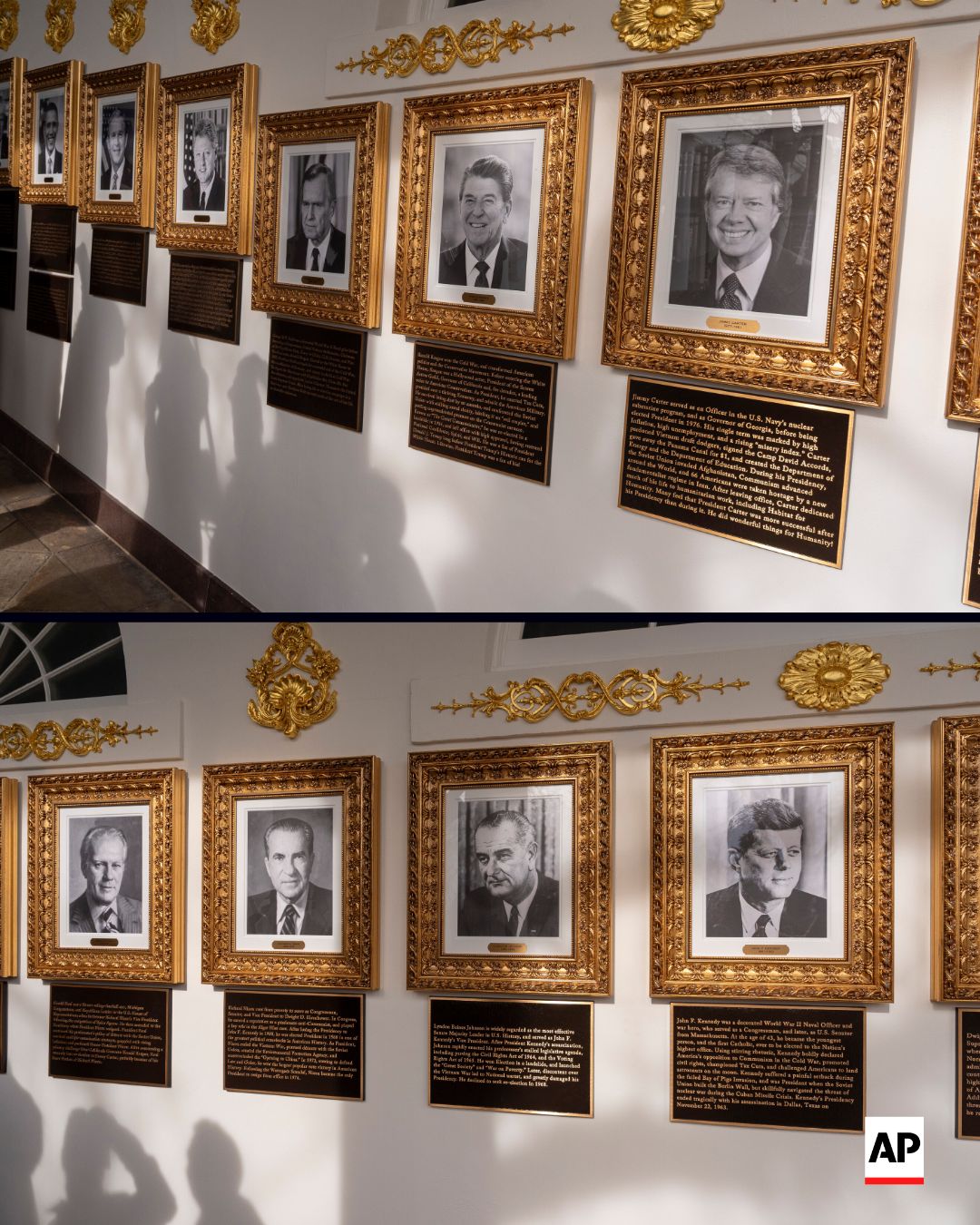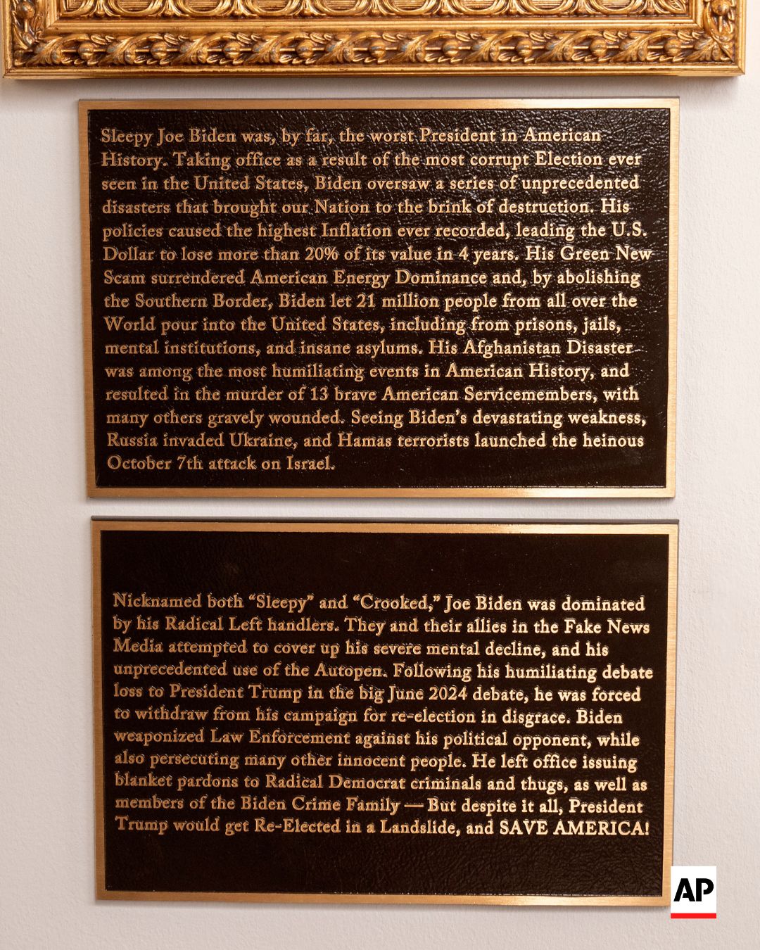 Bir çox sələflərinin portretləri altındakı mətnləri hazırkı ABŞ Prezidenti Donald Trampın şəxsən tərtib etdiyi bildirilir. Məsələn, 46-cı ABŞ lideri Co Baydenin portreti əvəzinə fotoda avtoqələmlə yazılmış bir yazı görmək olar. Şəklin altında isə keçmiş Ağ Ev rəhbəri haqqında “ABŞ tarixinin ən pis prezidenti”, “ağır əqli tənəzzül”, “yuxulu Co” kimi bir sıra istehzalı ifadələr yer alır.
