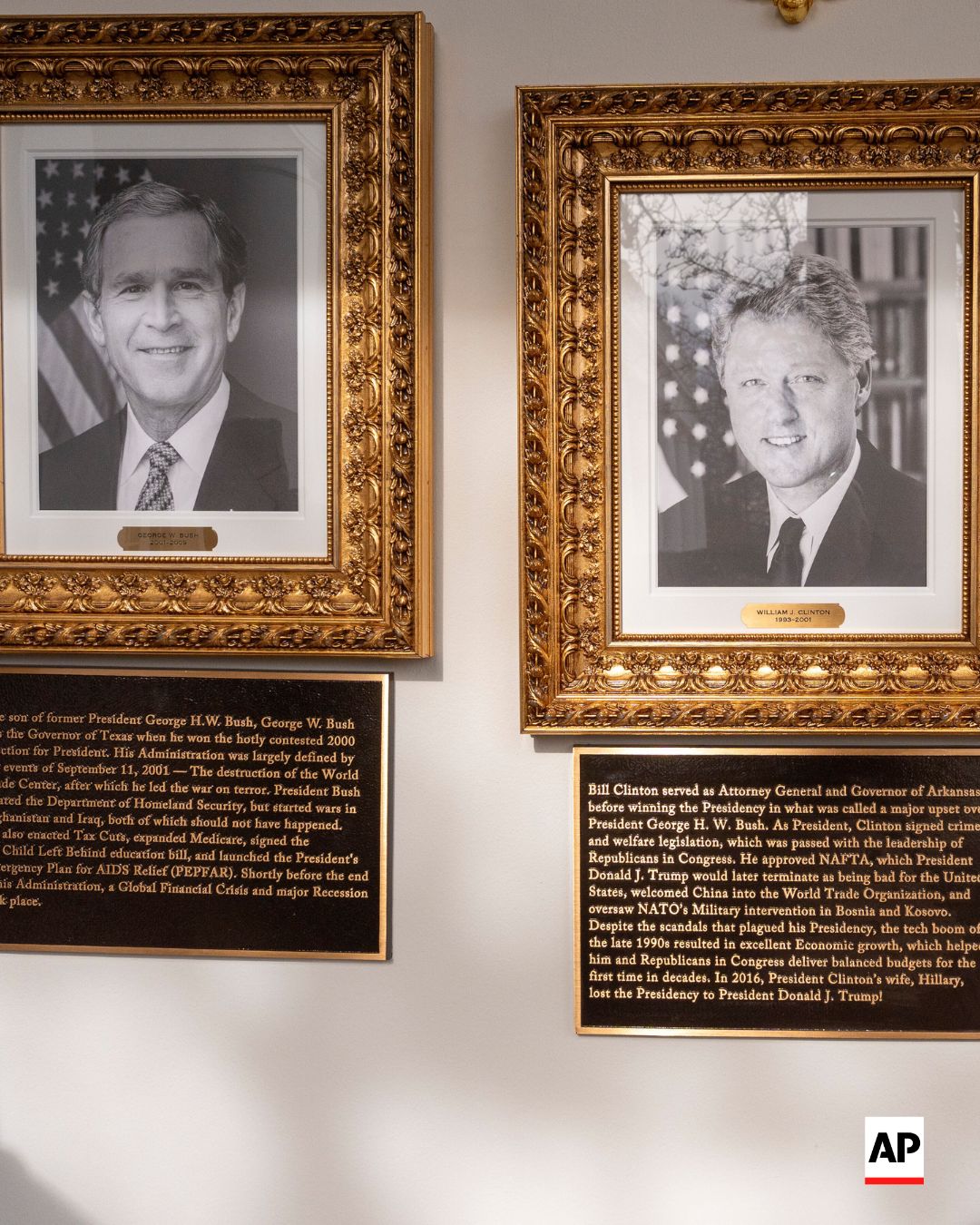 ABŞ-nin 44-cü Prezidenti Barak Obamanın portreti altında onun “Amerika tarixinin ən mübahisəli siyasi fiqurlarından biri” olduğu qeyd edilib. 42-ci Prezident Bill Klintona həsr olunmuş xatirə lövhəsində Trampın 2016-cı ildə onun həyat yoldaşı Hillari Klintonu seçkilərdə məğlub etdiyi yazılıb.