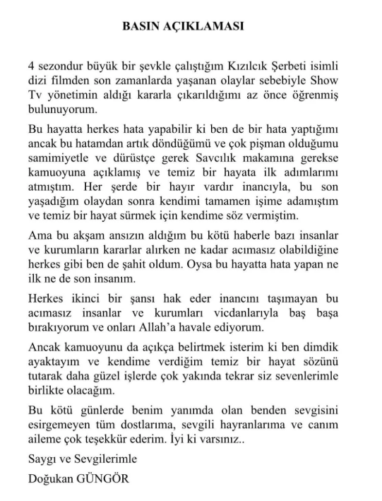 Xatırladaq ki, Doğukan Güngörün serialdan çıxarılmasına səbəb narkotik testi analizlərinin müsbət çıxmasıdır.