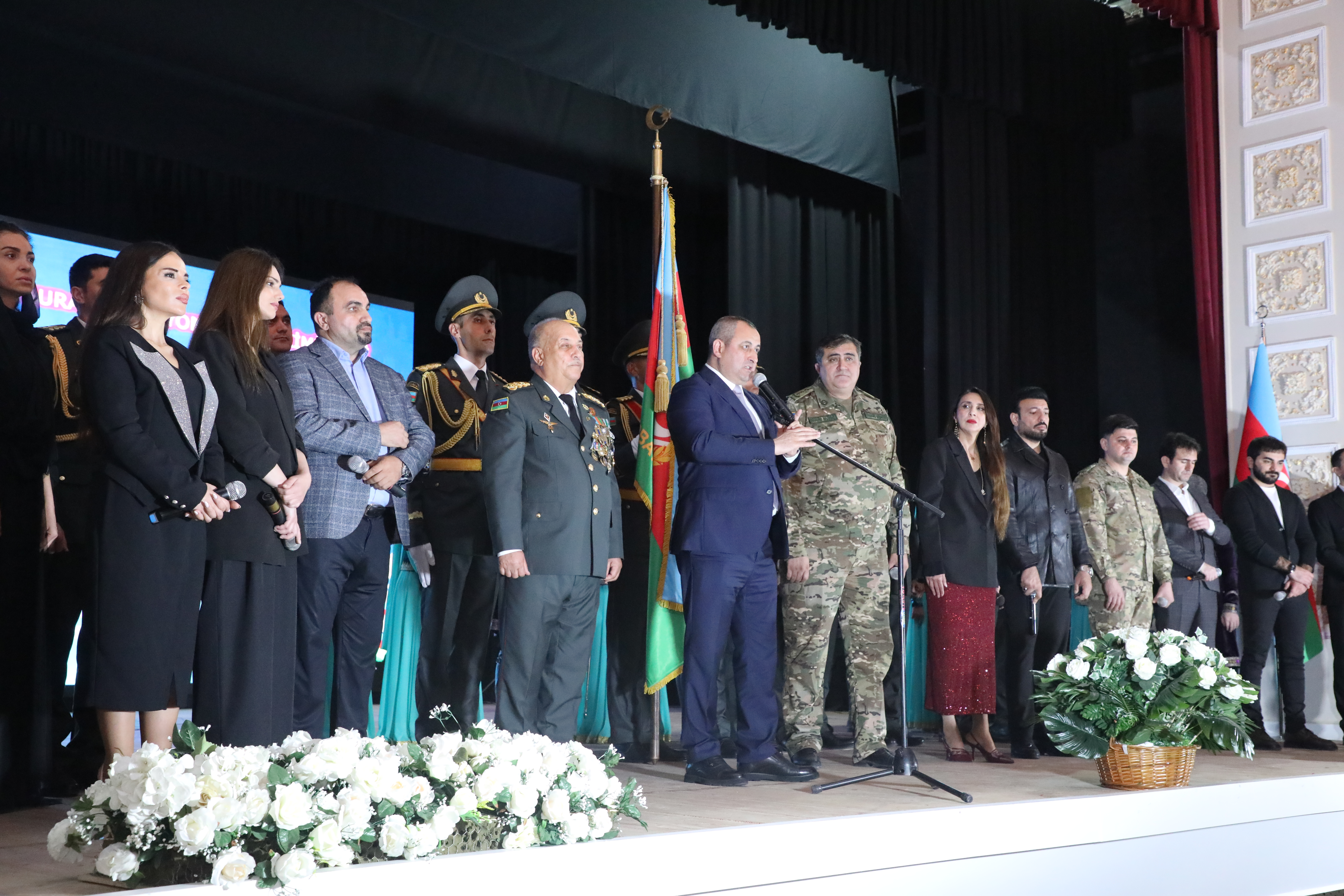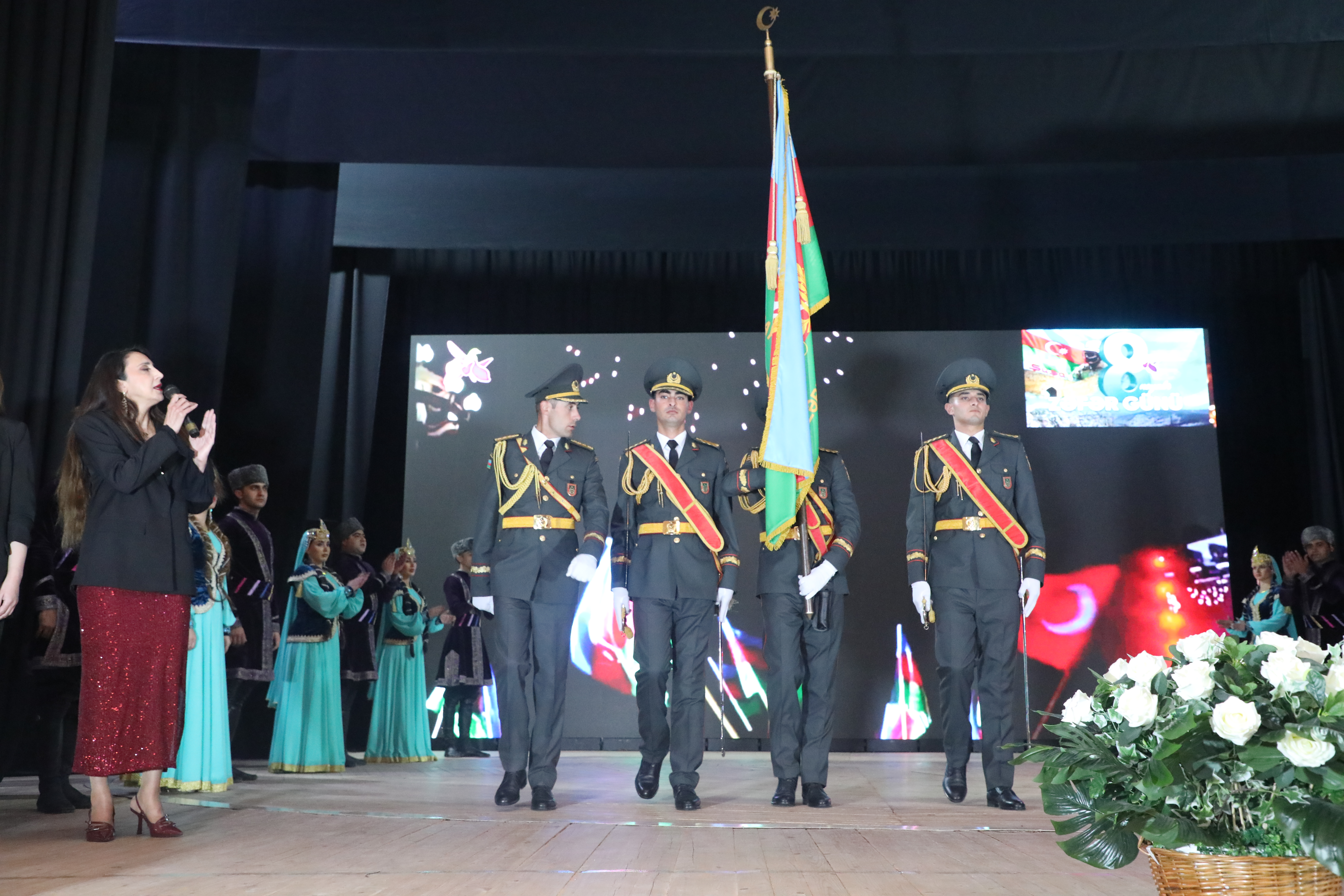 Əməkdar incəsənət xadimi, Prezidentin fərdi təqaüdçüsü, müharibə və Silahlı Qüvvələr veteranı polkovnik Abdulla Qurbaninin ssenarisi və rejissorluğu ilə hazırlanmış “Zəfər Bayrağına düzlən!” adlı vətənpərvərlik tədbiri Vətən müharibəsi günlərində Şuşa şəhərinə sancılan və Qələbəmizin rəmzinə çevrilən Zəfər bayrağının Fəxri Qaravolun müşayiətilə təntənəli şəkildə zala gətirilməsi ilə başlanıb. Bakı Bələdiyyə teatrının aktyorları 2020-ci il 20 sentyabrda başlanan müqəddəs savaşın tarixindən söhbət açıb, Ulu Öndər Heydər Əliyevin zəkasının işığında Müzəffər Ali Baş Komandan cənab İlham Əliyevin rəhbərliyi altında Vətən Müharibəsində qazanılmış Şanlı Qələbədən bəhs edən kompozisiyalarla çıxış ediblər, eləcə də müharibə dövründəki hərbi əməliyyatlardan görüntülər nümayiş etdirilib. Həzi Aslanov adına Ordu İdeoloji və Mədəniyyət Mərkəzinin Mahnı və Rəqs Ansamblı və solistlər Zəfərimizi tərənnüm edən mahnılarla, xoreoqrafik kompozisiyalarla çıxış ediblər. Vətənpərvərlik ifalarının mahir ifaçısı, xalq artisti Mübariz Tağıyevin ifası da böyük coşqu ilə qarşılanıb.