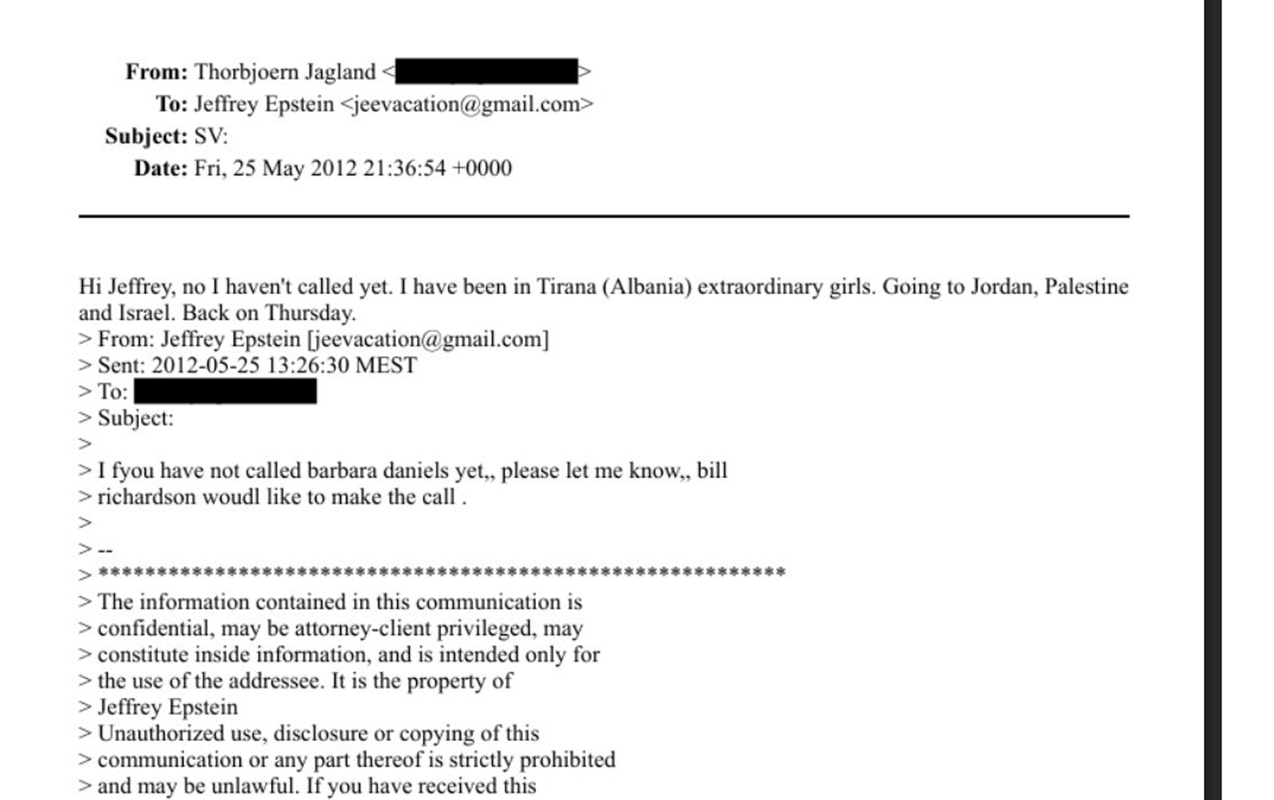 ABŞ Ədliyyə Departamenti tərəfindən ötən həftə açıqlanan “Epsteyn sənədləri”ndə Avropa Şurasının 10 il müddətində baş katibi olmuş Torbyorn Yaqlandın da adı keçir. Sənədlərdən görünür ki, Yaqland Epsteynlə şəxsi əlaqələrə malik olub. 2012-ci ildə elektron poçt üzərindən Epsteynə yazdığı məktubunda Albaniyaya rəsmi səfərindən bəhs edib. Daha sonra qeyd edib ki, “Tiranada gözəl qızlar var”. Bu ifadə mediada geniş müzakirə olunub Yaqlanda hədyanlar yağdırılsa da, sonradan onun daha ciddi qüsurları tapılıb. Bəlli olub ki, AŞ baş katibi ayrı-ayrı ölkələrin rəhbərləri ilə Epşteyn arasında vasitəçilik edib və bunun üçün özünün diplomatik statusundan yararlanıb.