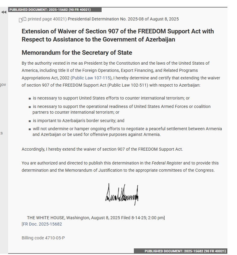 Bununla da, Tramp bu qərarla “Azadlığa dəstək Aktı”nın 907-ci düzəlişinin müddəlarının tətbiq edilməsindən imtinanı uzadıb.