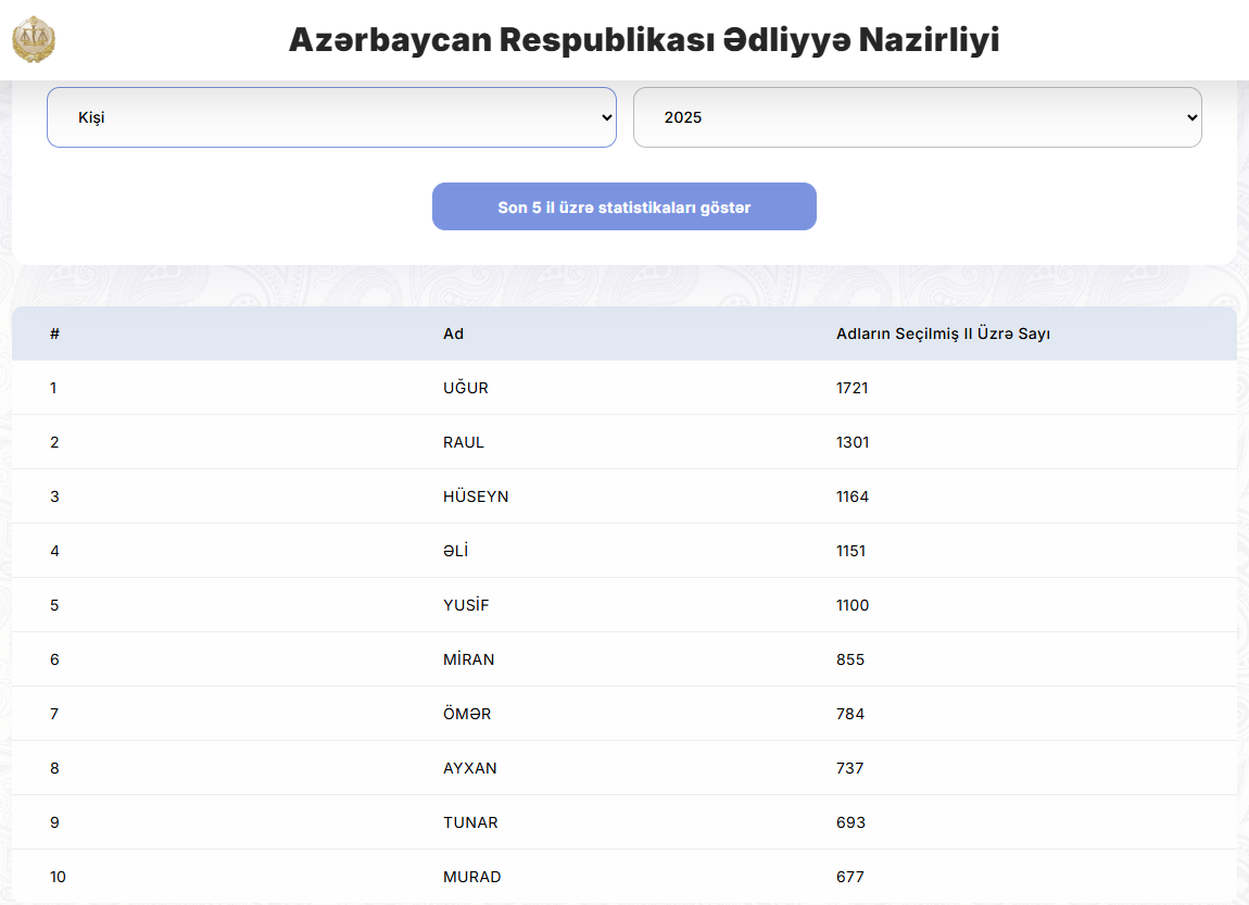Son 5 il üzrə adların siyahısında isə Uğur və Zəhra ilk sıradadır.