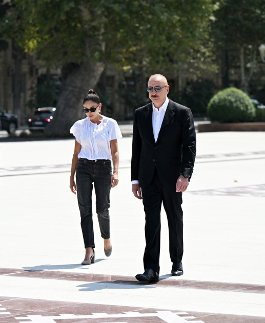 Как сообщает "Qafqazinfo", глава государства и первая леди посетили установленный в центре города памятник великому лидеру Гейдару Алиеву, возложили к нему цветы.