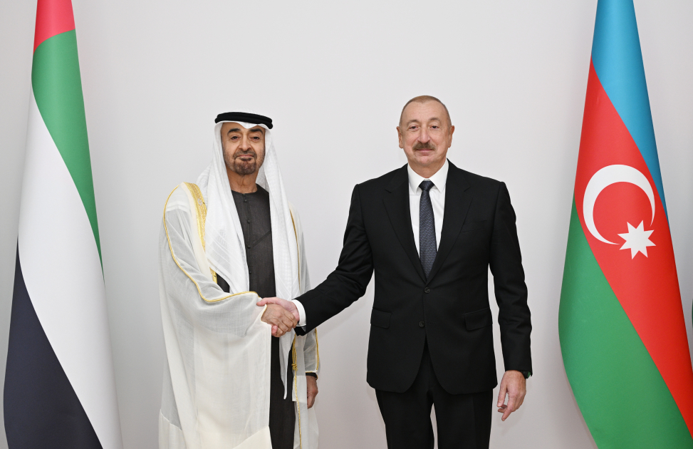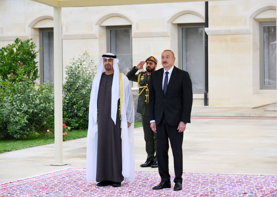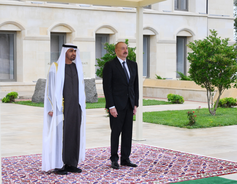Президент Азербайджанской Республики Ильхам Алиев и Президент Объединенных Арабских Эмиратов Шейх Мухаммед бен Заид Аль Нахайян обошли строй почетного караула.