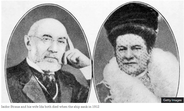 История последних минут жизни Исидора и Иды Штраус вошла в фильм "Титаник" 1997 года Джеймса Кэмерона, отмечает ТАСС. Они изображены сидящими вместе в каюте, которую заполняет вода.