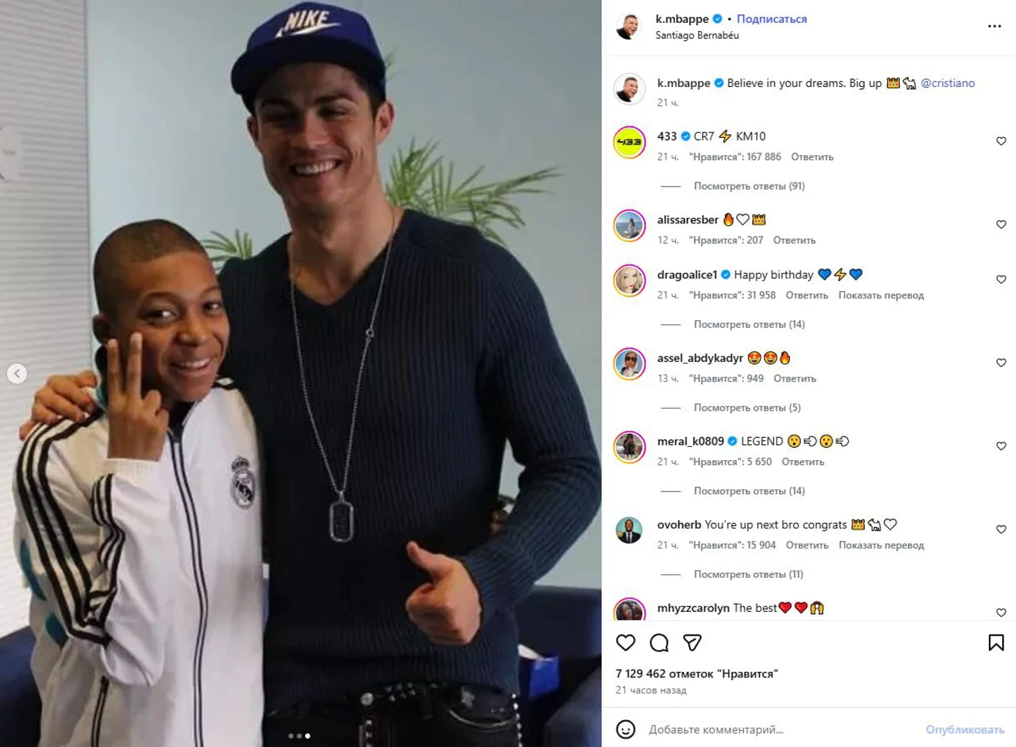“Верь в свои мечты. От души”, – написал Мбаппе, отметив аккаунт Роналду.